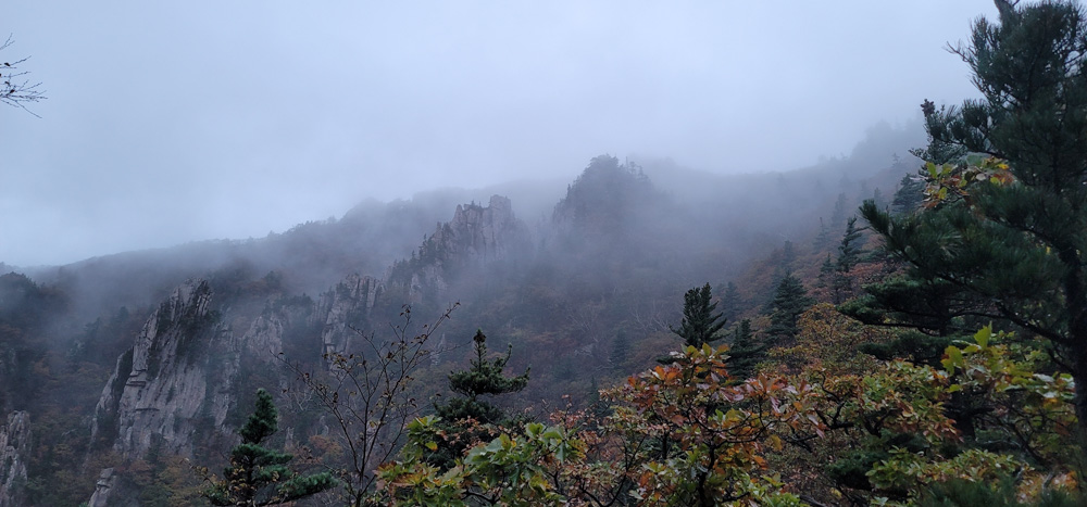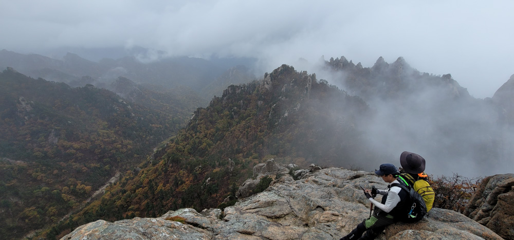 마등령 삼거리에서 시작되는 공룡능선은 무너미고개까지 5.1킬로미터인데, 처음엔 비교적 순탄한 편이나 갈수록 험해진다. 첫 번째 봉우리인 나한봉을 향해 가면서 너덜길 위 작은 고개에 올라서니 산 아래로 운해가 피어오르는 모습이 가히 선경이다. 구름바다 위에서 내가 마치 하늘에 떠 있는 기분이다. 다시 내려가다가 흰색 빛이 감도는 바위에서 사진을 찍으러 올라갔던 여자분이 굴러떨어지는 것을 목격했는데, 다행히 배낭을 메고 있어 크게 다치지는 않았다. 벌써 단풍은 지고 낙엽이 되어 고목 아래 쌓인 채 비를 맞고 있다. 9시 40분에 나한봉(?)을 지난다. 그리고 10시에 일행들과 합류하여 길목에서 잠시 쉬며 간식을 먹고 이동, 20여 분 후 킹콩바위 앞에 서게 되었다. 바위의 형상이 거대한 킹콩을 닮은 암벽을 오르며 바위와 한 몸이 되어보기도 했다. 울퉁불퉁 제멋대로 솟은 바윗길 걸음마다 다른 얼굴을 보여주는 모습의 능선길에서 수문장 같은 바위 사이를 지나자 멋진 비경이 펼쳐진다. 구름 사이로 드러난 옹골찬 바위에서 견뎌온 세월의 아득함이 느껴진다.