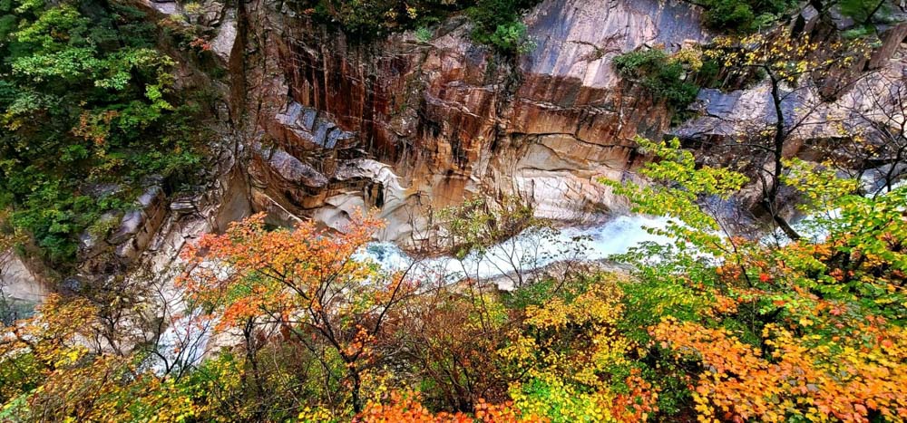 이제 공룡능선 산행의 마무리를 위해 아쉬움을 뒤로하고 무너미고개로 향한다. 오르고 내리는 재미가 있는 공룡능선 끝 지점 무너미고개(1,110미터)에서 가파르게 내려오는 5.5킬로미터 구간의 천불동계곡은 지리산 칠선계곡, 한라산 탐라계곡과 함께 국내 3대 계곡에 속한다. 계곡 일대에 펼쳐진 바위가 천 개의 불상과 비슷하다고 해서 붙여진 이름이다. 금강산이 1만 2천봉이라면 설악산은 1만 2천골이다. 그만큼 골이 깊고 계곡이 많다. 세월이 흘러도 멎지 않고 흐르는 계곡물소리, 그리고 하늘에서 물이 쏟아지듯 우렁차고 장쾌한 천당폭포 앞에 서니 지친 몸의 피로가 씻기고 머리가 맑아진다. 이렇듯 산에서는 영혼을 위로받고 마음에 위안을 얻을 수 있다. 주변은 여기저기 단풍으로 물들고 있었다. 소신공양 같은 붉은 단풍, 가을 속으로 풍덩 빠져드는 느낌이다. 단풍은 바람 따라 흐르고 낙엽은 이리저리 흩어진다. 바람에 가을 냄새가 묻어난다. 봄이 희망이라면 가을은 역사다.