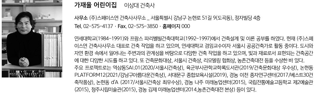 GAJAEUL Kindergarten Architect | Lee Sangdae_Spaceyeon Architects Client | Seodaemun-gu office Supervisor | Lee, Namhak Construction | The winwoo Construction Project team | Kim, Daehan / Lee, Kyungsub / Kim, Seunghyun / Seo, Sehee / Song, Kwanho / Yeon, Woonghee Location | 31, Moraenae-ro 15-gil, Seodaemun-gu, Seoul, Korea Program | Daycare Center Site area | 1,069.60㎡ Building area | 613.82㎡ Gross floor area | 2,141.34㎡ Building to land ratio | 57.39% Floor area ratio | 139.22% Building scope | B1F - 3F Structure | RC Exterior finishing | Ceramic panel, Cedar panel Interior finishing | Eco-friendly water paint Design period | 2016 - 2017 Construction period | 2017 - 2018 Photograph | Kim, Jaekyung Structural engineer | Harmony Structural Engineering Mechanical engineer | Sungshin Machine Electrical engineer | Cheonil E&C, Co., Ltd |