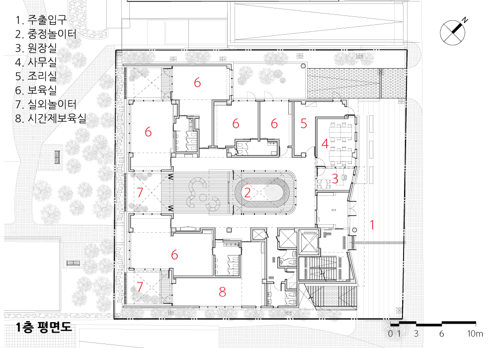 대부분의 보육시설은 실내공간으로만 구성되고, 현관문을 나설 때, 외부 마당이 전개된다. 이러한 일반적 보육시설을 탈피하여 어린이공원과 접한 면에 보육공간을 배치하고, 보육실들 사이로 공원의 확장 개념으로 마당이 결합되는 보육환경을 만들고자 하였다. 언제든지 나가서 밟을 수 있는 잔디의 감촉과 바람, 햇빛의 기억이 자라나는 도시 속 영·유아들의 정서 발달에 비타민과도 같이 작용하기를 바라는 마음으로 건물을 구상하였다.