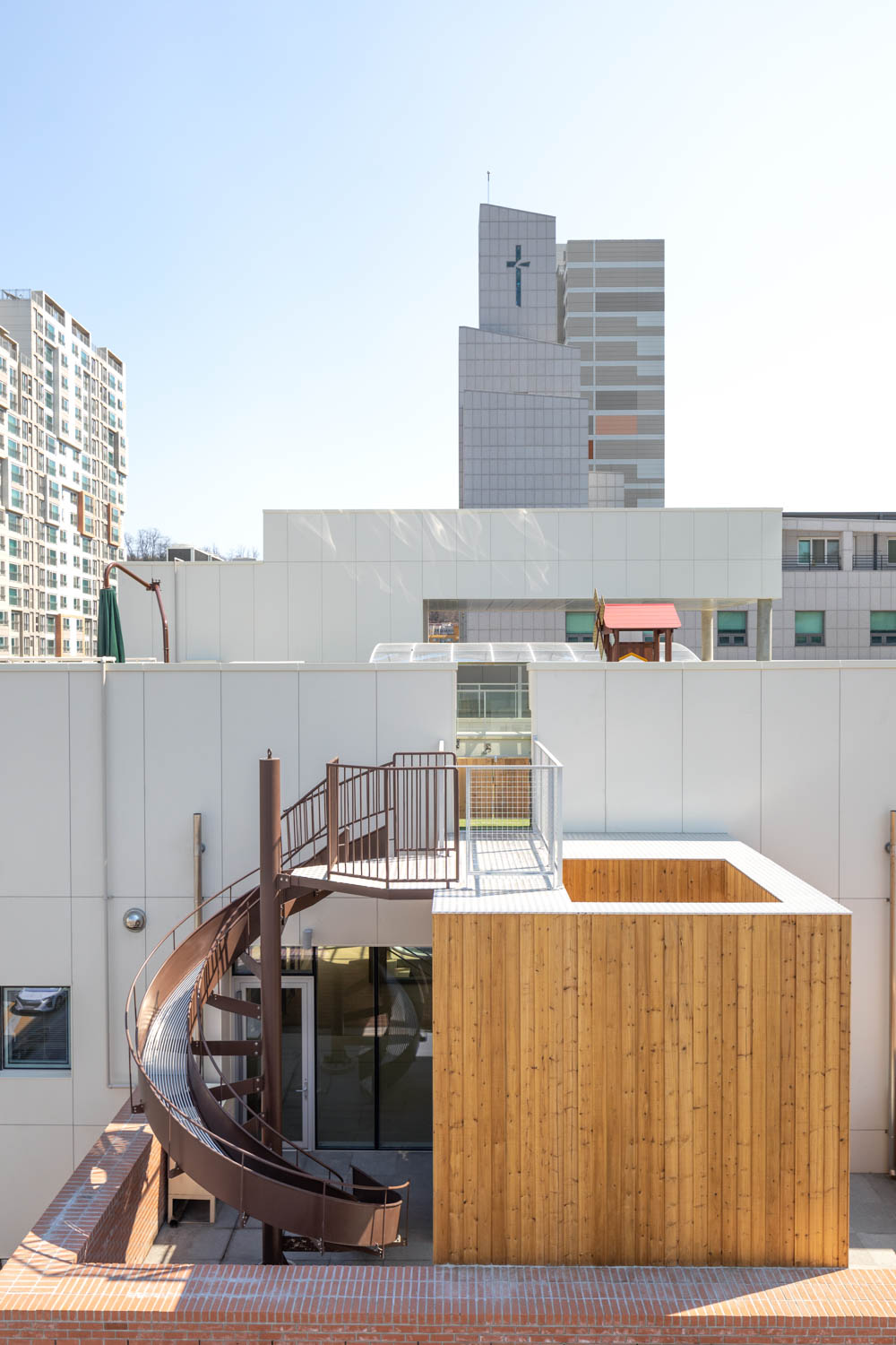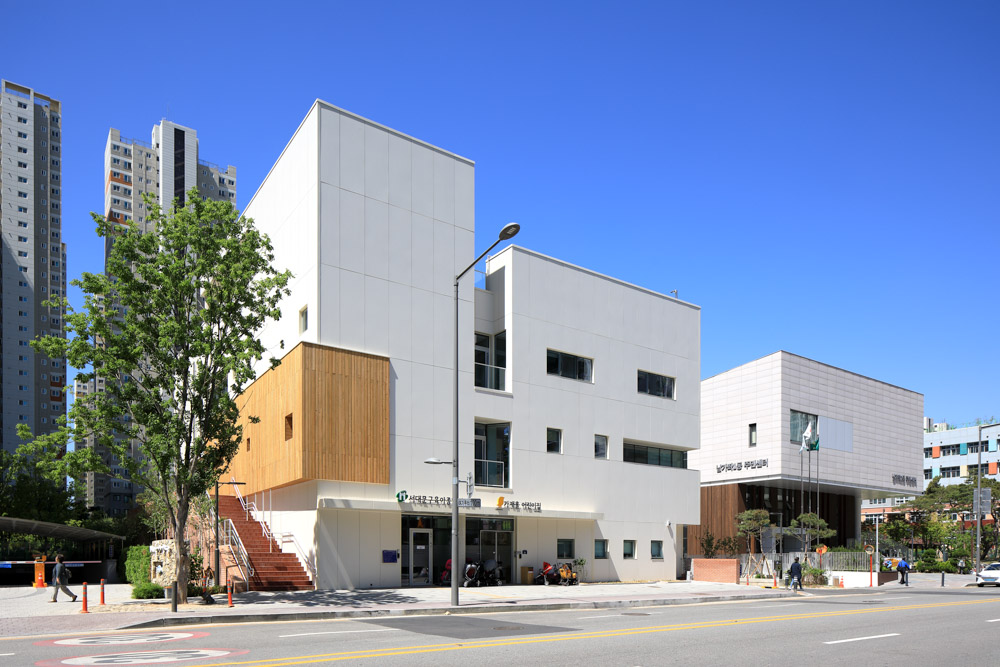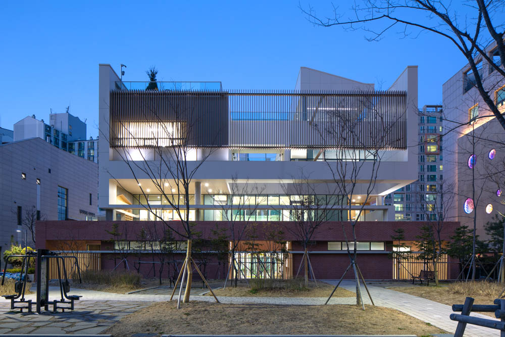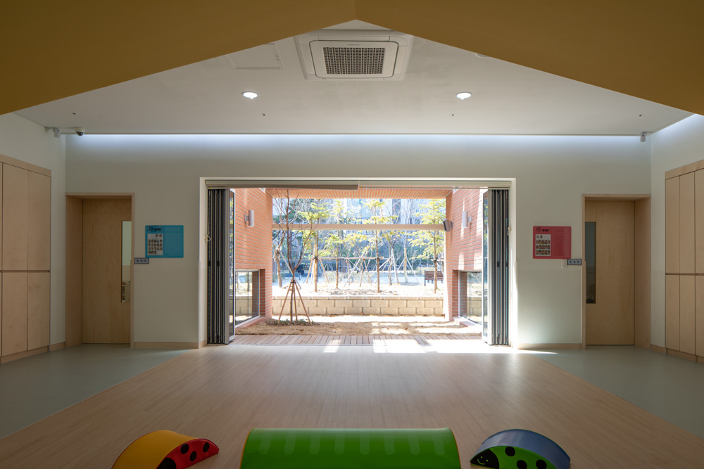 The birth of new life in this world is a blessing. Therefore, the older generation wants to give anything to the newborn lives. Consequently, it is natural that the question about ‘which space will be best for infants and toddlers to experience the new world’ becomes the most central theme in this architecture project. Humans have developed DNA as everyday existence with nature through long hunting and agricultural life. As an inherent source for modern people who adapt to urban life, the experience of nature becomes an essential living factor. The fundamental concept of this project is to provide the mutual experience with nature, which is the essential physical experience, to infants and toddlers who were born newly. Fortunately, one side of the site faces the city street while the other faces the children's park. Most childcare facilities consist only of indoor spaces, and when leaving the front door, an external yard spreads. A childcare space was placed on the side adjacent to the children's park by escaping from these general childcare facilities. A childcare environment was created in which the yard was combined with expanding the garden between the childcare rooms. The building was designed to act as a vitamin to the emotional development of infants and toddlers in the city where the feeling, wind, and sunlight of grass that can be stepped on at any time grow. The programs of this project are roughly divided into 2. It is a municipal daycare center on the 1st floor and a comprehensive childcare support center on the 2nd and 3rd floors. The municipal daycare center on the first floor consists of five individual daycare rooms, including an office and cooking space, a daycare center for infants aged 0 to 5, and a part-time daycare room, along with a courtyard. The comprehensive childcare support center consists of an indoor playground for infants and toddlers, a toy rental room, a community room used with parents on the second floor, a cooking experience room, an office space, and a multi-purpose auditorium on the third floor. The roof consists of an outdoor play area and outdoor learning space. Unlike childcare centers providing all-time care, the comprehensive childcare support center is an important facility that offers complete support for nursing home and adjacent childcare facility. Just as a yard was provided to the daycare center on the first floor, the part-time nursery space on the second floor also faced the children's park and created a yard to develop a relationship with the outside. In addition, the courtyard, which is the center of the daycare center and the comprehensive childcare support center, was planned to function as an independent facility but to share the yard, maintaining the appearance of a child-rearing community. In the external plan, the open design is reflected so that the children's park in the southwestern can function as a huge front yard of high rise apt visually and physically, and tried to adjust with louver so as not to be shrunk the huge volume of high-rise apartments. The northeastern front facing the city road is planned to consider the facility's privacy considering the scenery as a comprehensive childcare facility. In terms of architectural materials, the total volume is made with a thick ceramic film panel, creating the mild image of a childcare center and the massing. In addition, it was considered to feel the texture of nature by partially using the red brick and cedar in the lower part. Gajaeul Daycare Center, a comprehensive childcare facility in Seodaemun-gu, is a work completed with a proposal for a childcare environment that can be achieved in the city by combining architectural spaces and material elements with the surrounding environment to provide natural experiences to infants and toddlers.