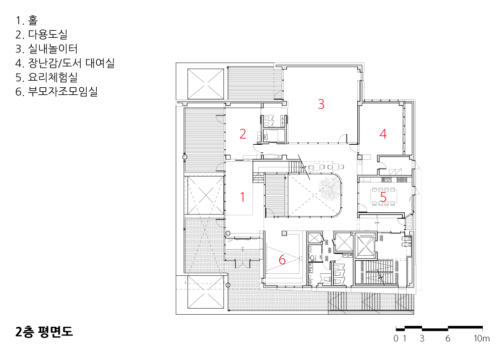 상시 돌봄이 이루어지는 어린이집과 달리, 육아종합지원센터는 육아를 하는 가정과 인근 어린이집 시설들에 대한 종합지원을 하는 중요한 시설이다. 1층 어린이집에 직접적 마당을 제공하였듯이, 2층의 시간제 보육공간 또한 어린이공원과 접하여 마당을 만들어 외부와의 관계를 만들려 하였다. 또한 어린이집과 육아종합지원센터의 중심이 되는 중정을 계획하여, 각각 독립된 시설로서 기능하지만 중정을 공유함으로써 육아 공동체의 모습을 유지하고자 하였다.