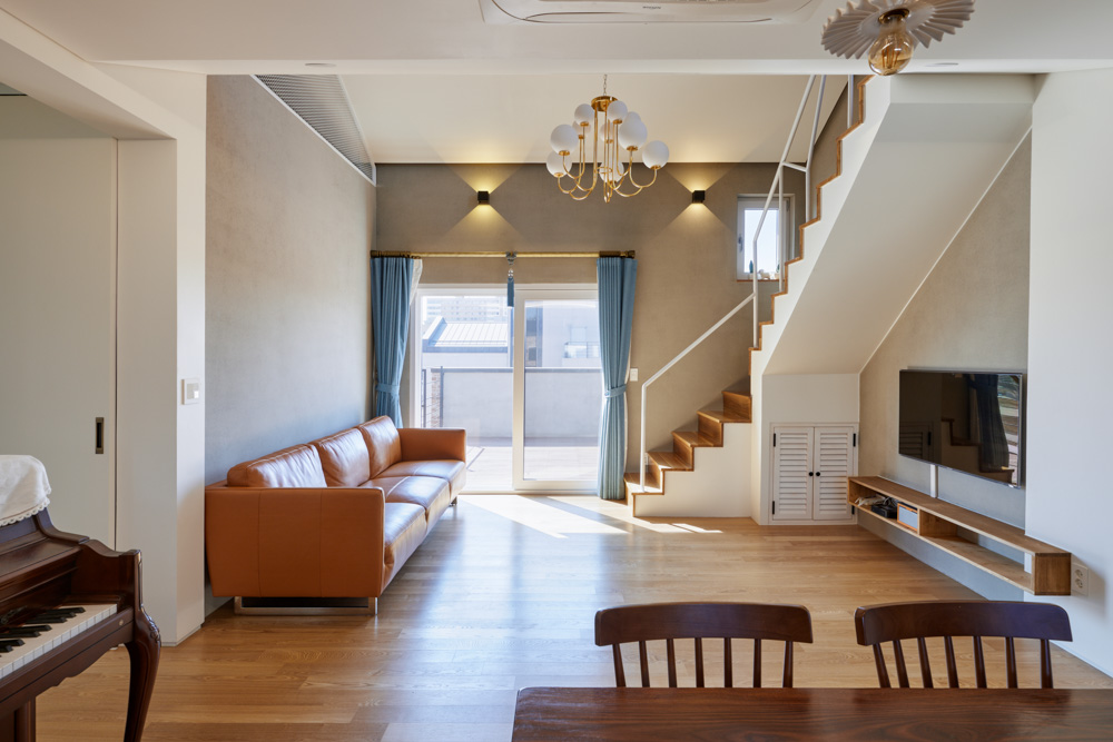 The most significant difference between the second and third floors is the direction. From the southwest house, the second floor was placed more eastward, and the third floor was placed more westward. Due to the slight change in direction, I created a rich outer space, and the scenery from home is completely different. It is the difference from apartments stacked in the same structure and showing similar scenery front and back on each floor. A gable attic was placed on the third floor with two rooms, and a ceiling was built. Life changed as space changed. Previously, they used to meet on special days such as holidays and birthdays, eat and leave, but living in one house will inevitably increase our time together. The building owner said, “If it were uncomfortable for people to gather, I wouldn’t want to live together, but it was good for people to live in a crowded way. “ The house’s name is ‘Binachae.’ It means ‘empty, share and fill,’ and named by the building owner who is a sincere Christian she was asked the meaning of the name, the building owner said like this. “I was greedy when building the house, but I emptied it for family, and the meaning of the name is about filling the house with gratitude for the happiness obtained by emptying, sharing with people around us through the house.