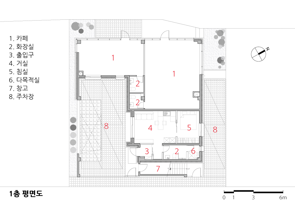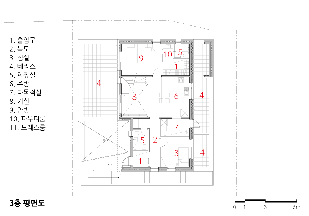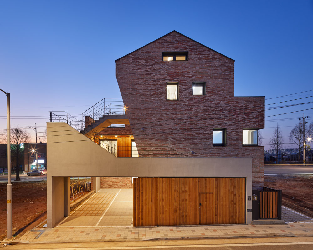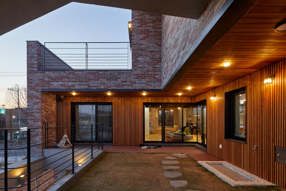 The building owner listed the scenery of dreaming life in detail rather than the specific shape when requesting the design. She depicted the image of the house with the sentence that reminds the look of life, such as “A house that doesn’t give influence to neighbors and laughs at the surroundings,” “A house where a child plays barefoot on stones in the sun-heated yard,” “A small tap where his father trims cucumbers and peppers,” “A house where children play,” “A kitchen for holidays, gatherings," and “Toetmaru that can share this or that talk while trimming anchovy with father." The site in which the house will be built is subject to the floor number restriction to 3rd floor or less due to district unit planning zone, and it is a multi-household dedicated site, so the scale and the density of future housing can be estimated. In general, the multi-household house aims to maximize the rental profit by expanding the numbers of a householder. However, the house requested by the client doesn’t aim at the rental income. We can empty the maximum space. When considering the story depicted by the building owner, she wanted to feel detached house. We should empty many things. The important point of the plan is to empty physical mass but fill the various lifestyles in it. It is arranged so that it doesn’t interfere with lighting even if the surrounding houses are filled, and the yard is set up on each floor so that three households can feel the atmosphere of detached houses in their respective homes. Unlike square houses in typical multi-family houses built to create the maximum floor area ratio and the maximum number of households, I planned out non-typical houses partially emptied as if they were breathing in the residential area. The entrances approached externally are 3. The 1st floor, where the father in his 80s stays, and the 2nd and 3rd floor, where children frequently come and go, are separated, which follows the approach method of the detached house even if it is a multi-household housing. Because the 2nd floor where the building owner couple stays and the 3rd floor where sister in law’s couple and nephew don’t cross the yard but lead to the external stairs, not influencing the access of each other. Because the multi-household housing in which one entrance is connected to each porch along with a stair can’t protect the privacy, it proposes to enter the house through external stair by separating the entrance from the beginning. So, three yards were created on each floor. You can see the parking lot and yard when you open the long sliding wooden door that acts as a fence on the first floor. Totmaru in front of my father-in-law’s living room is connected with my yard. The second-floor yard, where active families live, is covered with grass. The child pitches a tent in the yard and plays ball. Sometimes we all gather together to make kimchi and hang laundry. The third floor has a private veranda that leads out through the interior of the house. Rather than sharing one yard, I tried to build three separate yards in one house by making three yards tailored to each person’s lifestyle.