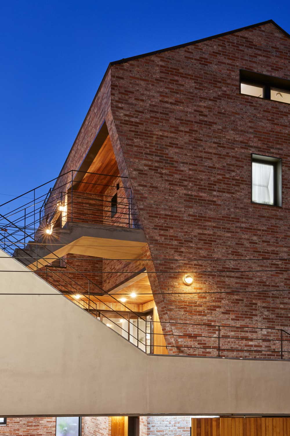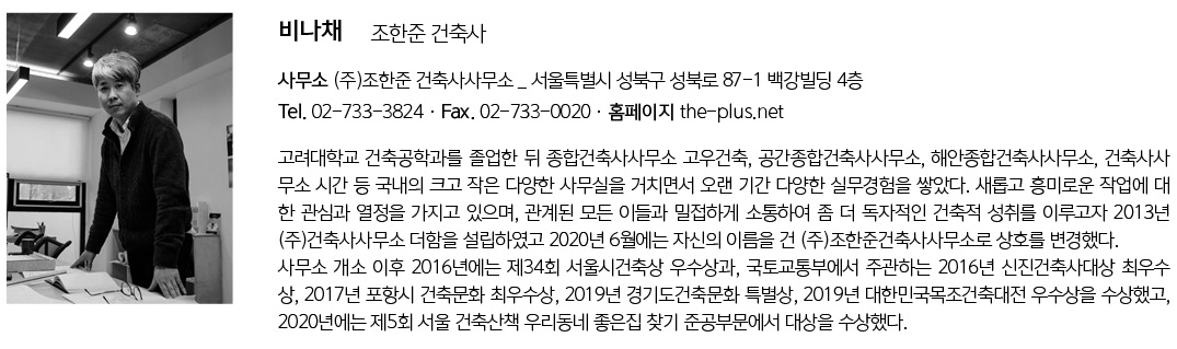 | 비나채 설계자 | 조한준_ (주)조한준 건축사사무소 건축주 | 최영옥, 박상택 시공사 | (주)시스홈종합건설 대지위치 | 경기도 시흥시 매화마을1길 13 주요용도 | 제1종근린생활시설 대지면적 | 329.00㎡ 건축면적 | 196.56㎡ 연면적 | 424.49㎡ 건폐율 | 59.74% 용적률 | 109.27% 규모 | 지상 3층 구조 | 철근콘크리트라멘조 + 벽식구조 외부마감재 | 지붕 _ 외단열+리얼징크 / 외벽 _ 적고벽돌(브리코) / 데크 _ 방킬라이 천연데크재 내부마감재 | 천장 _ 석고보드위 도장 / 내벽 _ 석고보드+도장, 노출콘크리트 표면 연출 마감 / 바닥 _ 2층 원목마루(지복득마루) / 그 외 합판마루 설계기간 | 2018. 11 – 2019. 03 공사기간 | 2019. 04 – 2019. 12 사진 | 노경 |