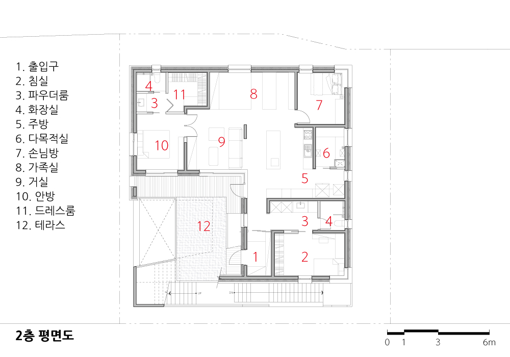 The building owner listed the scenery of dreaming life in detail rather than the specific shape when requesting the design. She depicted the image of the house with the sentence that reminds the look of life, such as “A house that doesn’t give influence to neighbors and laughs at the surroundings,” “A house where a child plays barefoot on stones in the sun-heated yard,” “A small tap where his father trims cucumbers and peppers,” “A house where children play,” “A kitchen for holidays, gatherings," and “Toetmaru that can share this or that talk while trimming anchovy with father." The site in which the house will be built is subject to the floor number restriction to 3rd floor or less due to district unit planning zone, and it is a multi-household dedicated site, so the scale and the density of future housing can be estimated. In general, the multi-household house aims to maximize the rental profit by expanding the numbers of a householder. However, the house requested by the client doesn’t aim at the rental income. We can empty the maximum space. When considering the story depicted by the building owner, she wanted to feel detached house. We should empty many things. The important point of the plan is to empty physical mass but fill the various lifestyles in it. It is arranged so that it doesn’t interfere with lighting even if the surrounding houses are filled, and the yard is set up on each floor so that three households can feel the atmosphere of detached houses in their respective homes. Unlike square houses in typical multi-family houses built to create the maximum floor area ratio and the maximum number of households, I planned out non-typical houses partially emptied as if they were breathing in the residential area. The entrances approached externally are 3. The 1st floor, where the father in his 80s stays, and the 2nd and 3rd floor, where children frequently come and go, are separated, which follows the approach method of the detached house even if it is a multi-household housing. Because the 2nd floor where the building owner couple stays and the 3rd floor where sister in law’s couple and nephew don’t cross the yard but lead to the external stairs, not influencing the access of each other. Because the multi-household housing in which one entrance is connected to each porch along with a stair can’t protect the privacy, it proposes to enter the house through external stair by separating the entrance from the beginning. So, three yards were created on each floor. You can see the parking lot and yard when you open the long sliding wooden door that acts as a fence on the first floor. Totmaru in front of my father-in-law’s living room is connected with my yard. The second-floor yard, where active families live, is covered with grass. The child pitches a tent in the yard and plays ball. Sometimes we all gather together to make kimchi and hang laundry. The third floor has a private veranda that leads out through the interior of the house. Rather than sharing one yard, I tried to build three separate yards in one house by making three yards tailored to each person’s lifestyle.