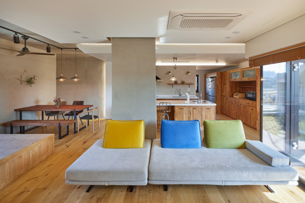 The most significant difference between the second and third floors is the direction. From the southwest house, the second floor was placed more eastward, and the third floor was placed more westward. Due to the slight change in direction, I created a rich outer space, and the scenery from home is completely different. It is the difference from apartments stacked in the same structure and showing similar scenery front and back on each floor. A gable attic was placed on the third floor with two rooms, and a ceiling was built. Life changed as space changed. Previously, they used to meet on special days such as holidays and birthdays, eat and leave, but living in one house will inevitably increase our time together. The building owner said, “If it were uncomfortable for people to gather, I wouldn’t want to live together, but it was good for people to live in a crowded way. “ The house’s name is ‘Binachae.’ It means ‘empty, share and fill,’ and named by the building owner who is a sincere Christian she was asked the meaning of the name, the building owner said like this. “I was greedy when building the house, but I emptied it for family, and the meaning of the name is about filling the house with gratitude for the happiness obtained by emptying, sharing with people around us through the house.