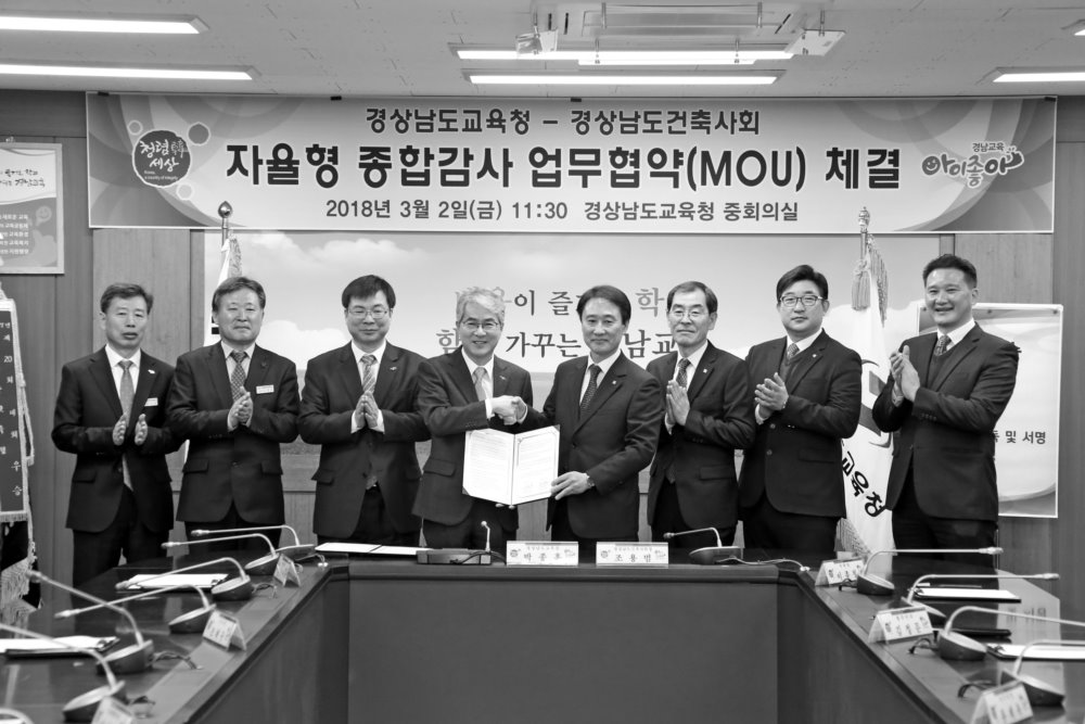 경상남도건축사회가 경남도교육청과 함께 MOU를 맺었다. MOU는 3월 2일 도교육청 중회의실에서 ‘자율형 종합 감사’ 활성화를 위한 것으로, 자율형 종합감사는 학교가 자율적으로 감사계획을 수립하고 교직원과 외부 전문가로 감사반을 편성해 종합감사하는 것이다.