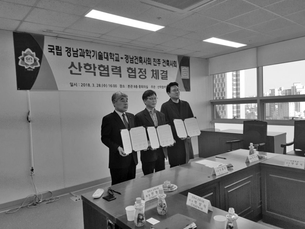 진주지역건축사회와 국립 경남과학기술대학교가 산학협력을 체결했다. 협약식은 3월 28일 경남과기대 본관 중회의실에서 관계 직원들이 참석한 가운데 진행됐으며 협약을 통해 학생 맞춤형 교육, 인적·물적 교류, 지역사회 발전을 위한 협력을 결의했다.