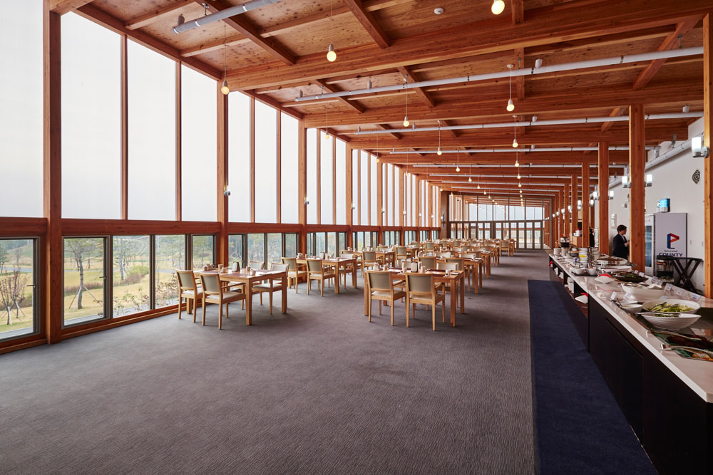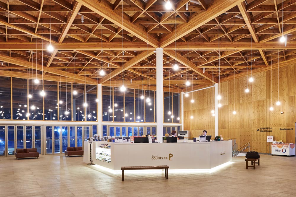 경제적인 모듈 설계를 위해 선택한 목구조이지만, 인테리어와 건축 목구조를 함께 조합하며 주어진 조건에서 가치를 극대한 클럽하우스이면서, 동시에 해질녘 무렵 클럽하우스의 로비에서부터 시작되는 백열등의 조명과 반투명 식당에서 투과되는 빛이 어둠을 밝힐 때 가장 아름다운 골프장 클럽하우스이다.