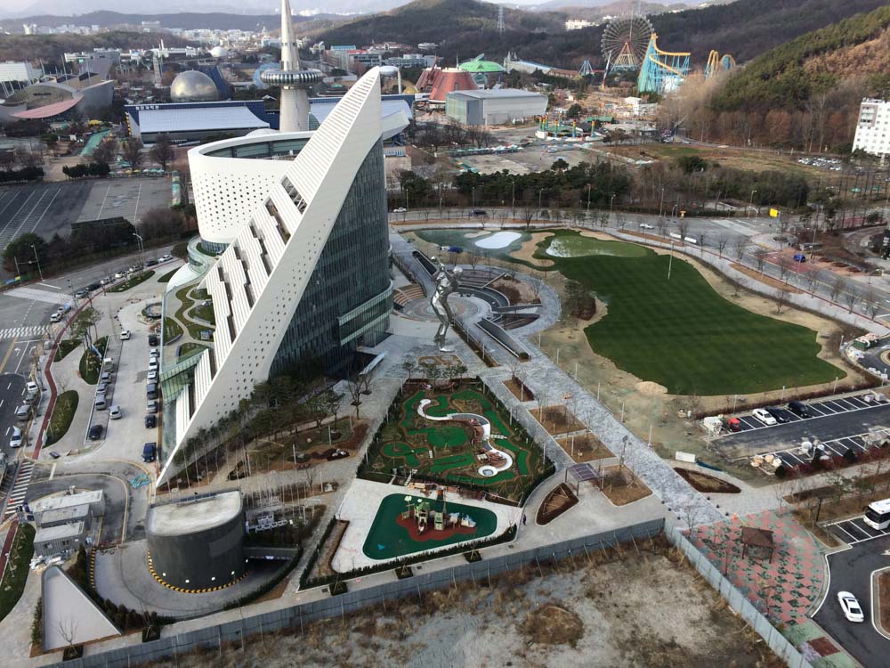 스크린골프는 노래방, 찜질방처럼 한국 현대문화가 낳은 산물이다. 골프존 대전 사옥(2014)은 실내에 연습장과 경기장을 넣어야 했다. 전 세계 어떤 건축물도 표준으로 삼을 만한 것이 없는, 세상에 존재하지 않는 건물을 설계해야 했다. 건축주는 자연을 형상화해달라고 했다. 골퍼들이 산지와 구릉을 오르내리며 접하는 산과 암반 등 자연 경관과 비거리를 늘리기 위해 디자인된 골프공의 오톨도톨한 표면을 모티프로 삼았다. 엑스포 과학공원 등 지역의 컨텍스트를 고려했다.