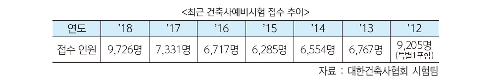 대한건축사협회(이하 사협) 시험팀은 건축사법시행령 부칙 제7조에 따라 2018년도 건축사예비시험에 사협 홈페이지를 통해 총 9,726명이 접수했다고 밝혔다. 건축사법시행령 부칙 제7조에 따라 올 5월 20일(일) 시행하는 2018년도 건축사 예비시험 원서접수가 3월 7일 마감돼 총 9,726명이 접수했다. 이는 지난해보다 2,395명이 늘어난 결과다. 사협 시험팀에 따르면 건축사법개정으로 건축사예비시험이 2020년부터 폐지될 예정임에 따라 실무수련을 할 수 없는 수험생이 건축사예비시험에 응시하려고 하면서 접수자가 증가했으며, 시험 장소는 4월 25일(수) 국토부, 사협 및 각 시도건축사회 홈페이지에 공고될 예정이다.