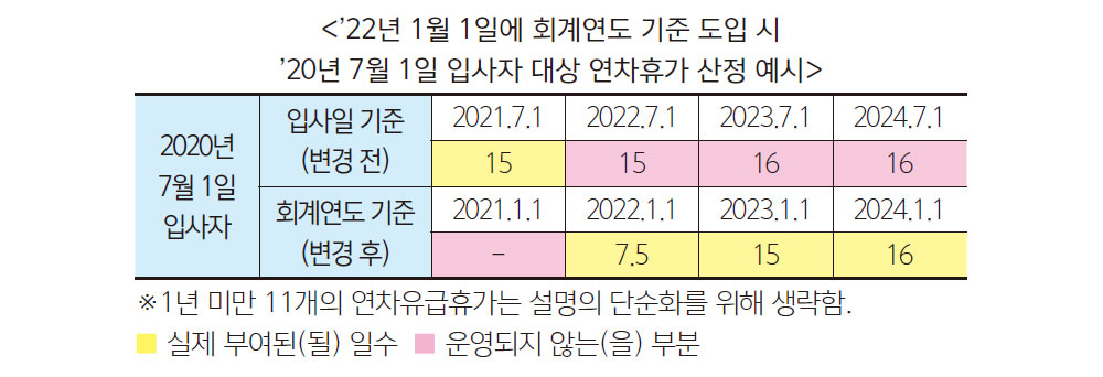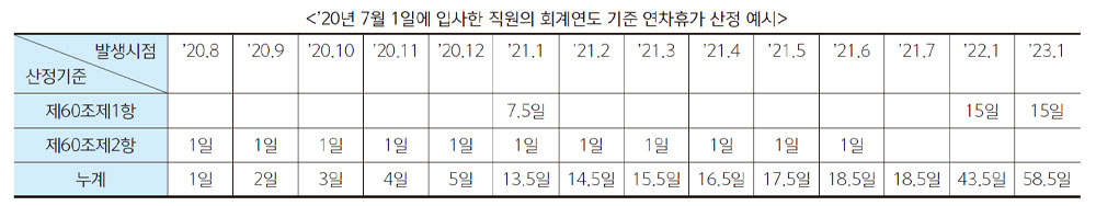 예를 들어 설명하자면 2020년 7월 1일 입사자의 경우 2021년 1월 1일까지 발생하는 연차유급휴가일수는 ①재직기간에 비례하여 발생한 7.5일(15일 × 184일/365일)과 ②2020년 7월 ~ 12월까지 개근으로 발생한 6일을 더한 총 13.5일이다.회계연도 기준 연차유급휴가관리제도는 근로기준법 제60조제1항에 따른 1년 이상 계속근로 시 발생하는 연차유급휴가를 대상으로 한다. 이때, 연도 중 입사자에게 다음 회계연도 시작시점(1월 1일)에 부여해야 하는 연차유급휴가는 1년 계속근로 시 발생하는 15일의 연차유급휴가일수에서 재직기간(입사일 ~ 회계연도 전일)에 비례한 일수가 된다.