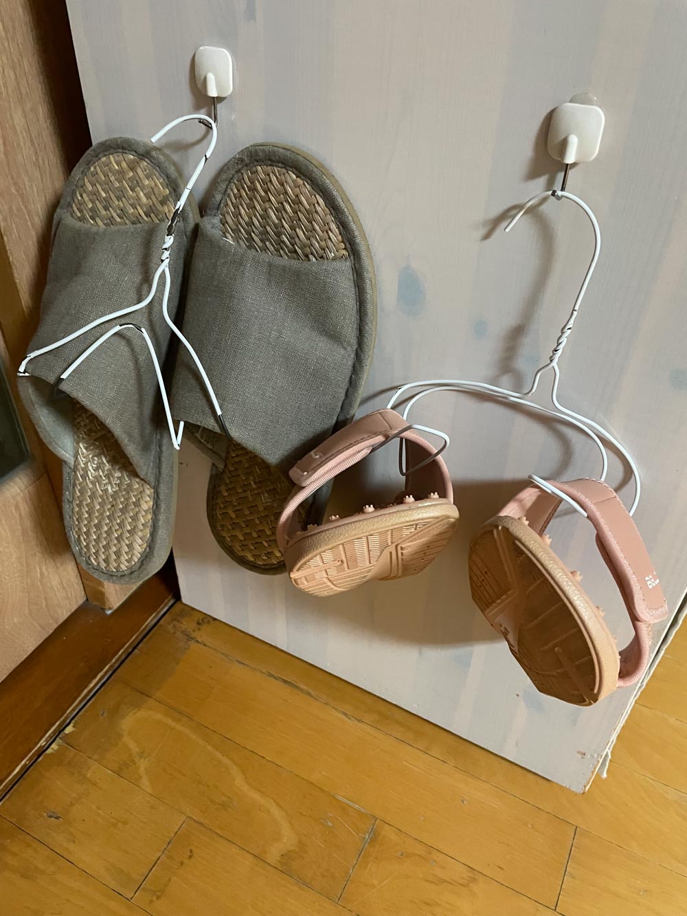 <사진 1> 옷걸이를 변형해 실내화 걸이로 만든 임 시변통