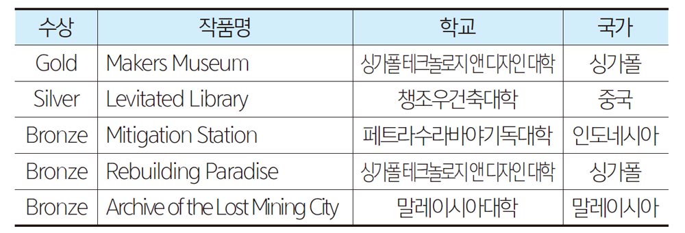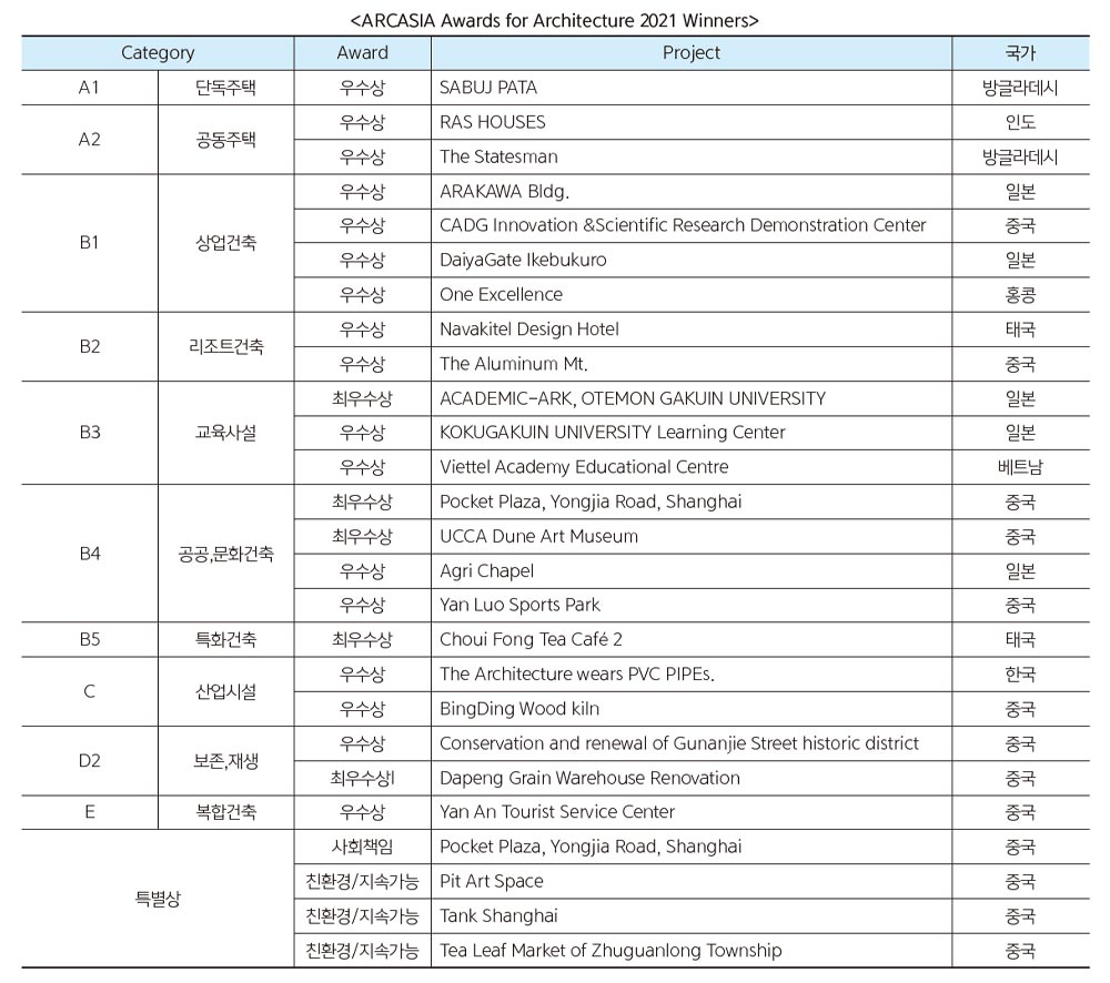 이번 AAA 2021은 2021년 건축상에 대한 공고를 하였고, 모두 10개의 분야에 대해 아시아 15개국의 회원들로부터 224개의 작품이 출품되어 보통 400~500개의 작품이 제출되던 것에 비해 출품작이 적었다. 모두 8개의 분야에 대해 디자인의 창의성과 우수성, 그리고 사회적 관계성 등을 주요한 관점으로 한 심사위원단 다섯 명의 심사 결과 25개의 작품이 우수작으로 선정되었고, 그중 한국의 스튜디오 아틀리에 마루의 구국현 건축사가 선정되었다. 이번 건축상에서 눈에 띄는 것은 역시 12개의 작품을 수상한 중국의 독주와 오랜만에 5개의 작품을 최우수상과 우수상으로 수상한 일본의 도약이었다. 25개의 수상 작품 중 동아시아(C 지역)에서 19개 작품을 수상한 것도 다소 의외의 결과였다고 생각된다.