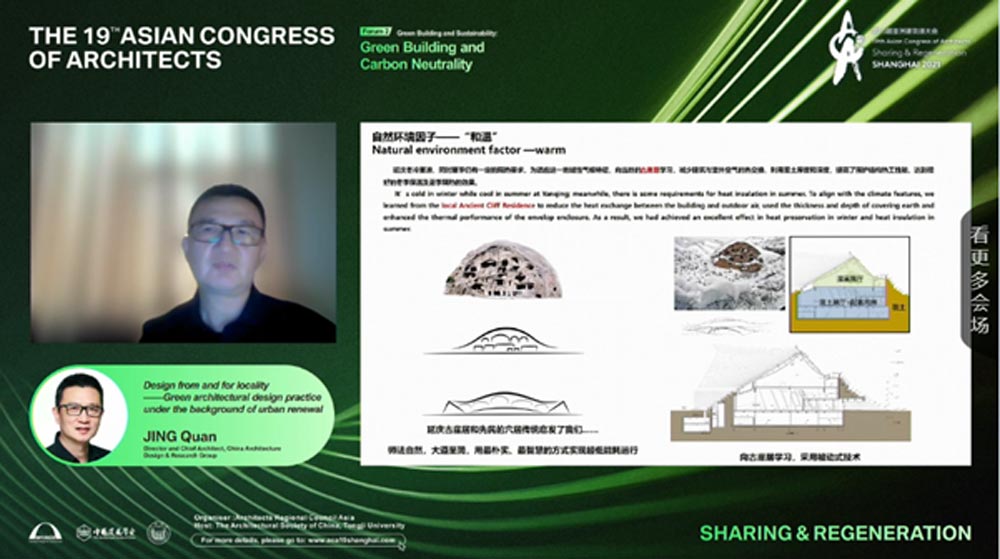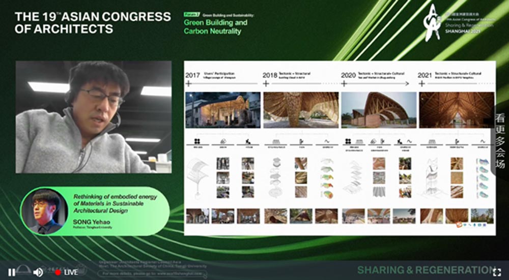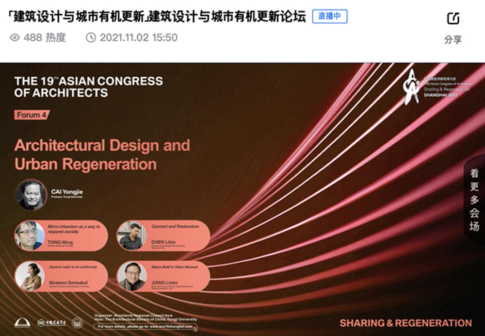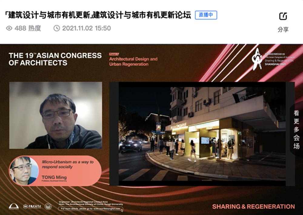 일본의 건축사 커플은 산업화 이전의 상태로 다시 자연과 재연결하려는 노력도 필요하다고 언급하면서, 자연의 생명력을 되살리는 시도를 건축을 통해 시도하 고 있다는 점이 평가할 만했다. 중국의 건축사는 현재의 급속한 공업화·도시화로 사라지고 밀려나는 시골의 마을 풍경을 재생하고 의미를 부여할 수 있다는 것을, 퇴락한 시장을 근대화하는 작업을 통해 보여주었다. 태국의 차트퐁 건축사는 건축하는 이들이 건축의 이상적인 상태를 드로잉 (Drawing)을 통해 달성하려 하지만 동시에 노점상들이 주는 실재하는 도시의 활력에서 배울 점이 많고, 코로나로 어려워진 이들과의 상생을 모색해야 할 것이 라는 점을 강조했다.