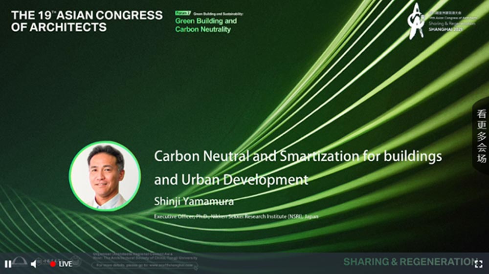포럼2는 친환경건축과 탄소중립이라는 주제로 린 보롱(칭화대 건축학부 부학장)의 사회로 4명의 연사(Shinji Yamamura, SONG Yehao, Ho Kin Wai, JING Quan)의 강의가 있었다. 먼저 신지 야마무라(니켄 세케이)는 ‘탄소중립과 건축물과 도시개발의 스마타이제이션(Smartization)’이란 주제로 니켄세케이에서 계획한 건축물, 학교, 도시계획에 대하여 설명하였다. 자연대류를 이용한 건축물, 장치를 이용한 효율화등 한정된 자원을 효율화 시키는 방법에 대하여 설명하고 이를 토대로 얼마나 에너지가 절약될 수 있는지 수치화할 수 있는 기술에 대하여 강의하였다.