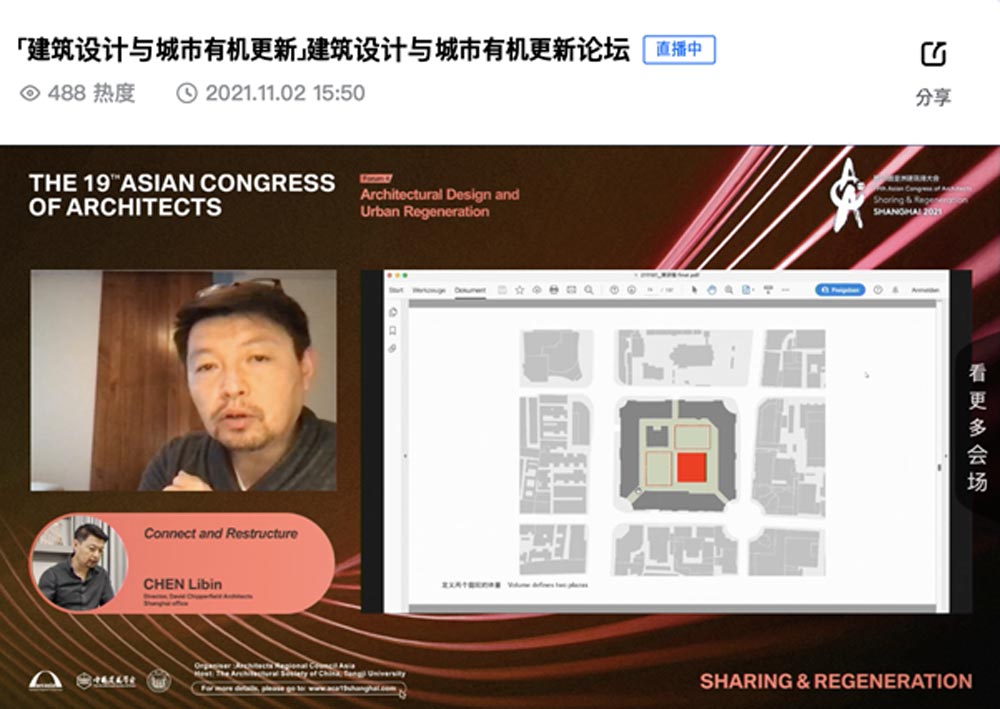 첫 번째 발표자인 상하이 데이빗 치퍼필드사무소의 디렉터인 첸 리빈은 ‘연결과 재구성(Connect and Restructure)’이라는 주제로 상하이에 설계한 건물을 중점적으로 소개하였다. 2000년에 설계된 Rock Bund 프로젝트에서 외국 대사관 건물로 지어진 낙후된 건물을 복원하면서 기존의 도시 가로 계획과 대지의 분할 등을 중점적으로 고려하였다. 상하이 시의회는 도시의 한 개 블럭을 차지하는 거대한 규모의 건물인데, 중정에 있었던 화재로 소실된 건물을 복원하고 시민들에게 부족한 공원을 제공하였으며 접근성을 높이기 위해 필로티를 이용하여 1층을 개방하였다. 첸 리벤은 기술적인 면 보다는 역사와 지역성을 이해하여 설계에 적용하는 것이 중요하다고 강조한다.