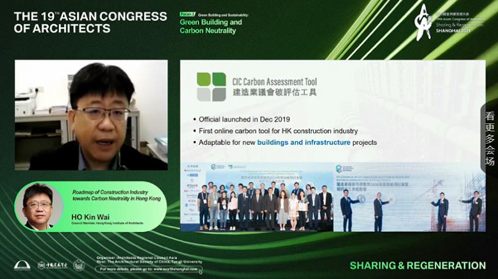 세 번째 연사 호 킨 와이(HKIA)는 ‘홍콩의 탄소중립을 향한 건설산업 로드맵’에 대하여 설명하였다. 홍콩에서는 친환경인증자재의 생산과 사용을 독려하기 위하여 online carbon tool을 개발하고 친환경 인증 자재 및 시스템을 건설현장에 적용할 때 정부에서 그린론(Green Loan)을 보증채무하는 프로그램을 운영하고 있어서 가급적 많은 현장에서 사용이 가능하도록 지원하고 있다고 하였다.