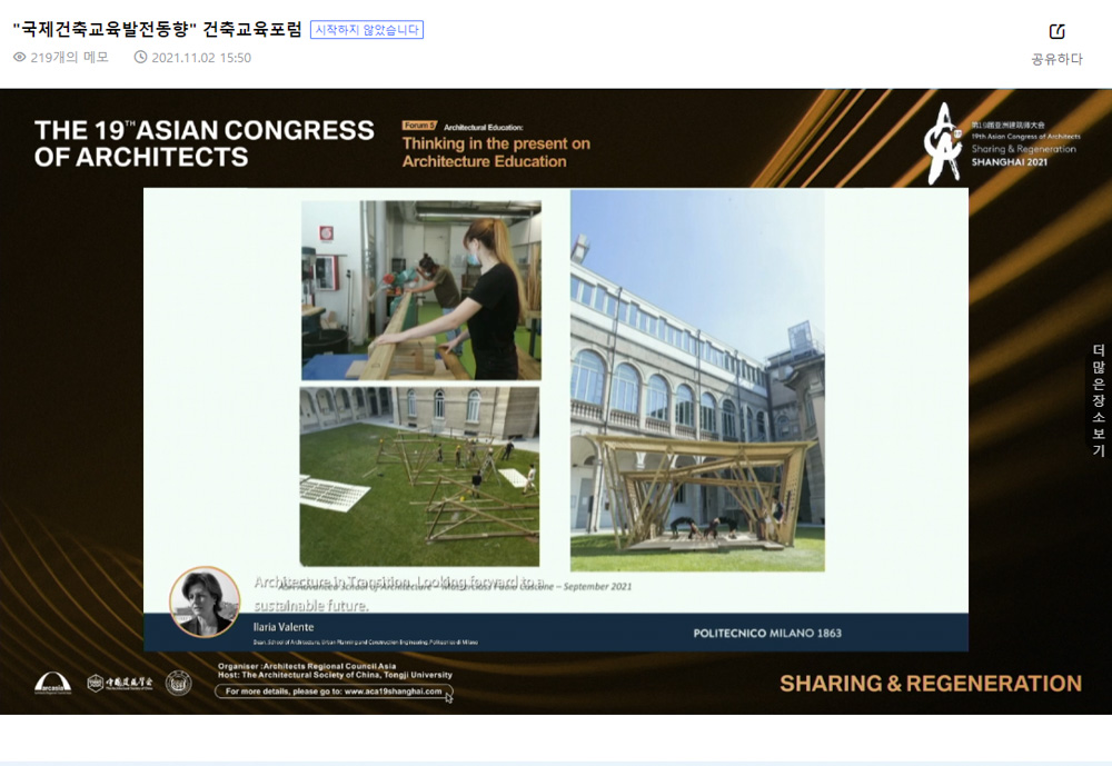 다음으로, 일라리아 발렌테 밀라노 공과대학 건축·도시계획 및 건설공학 학장은 ‘전환기 건축, 지속가능한 미래를 고대하며’라는 주제로 유엔의 지속가능한 개발목표와 유럽 녹색사업의 큰 틀을 언급하였다. 그는 세계에서 지역으로 다층적인 접근방식, 참여적, 다학제적인 동시에 자연과 다시 연결하고 소속감을 키우며 장소의 개별화와 생애주기적인 산업체계를 마련하려는 뉴 유러피안 바우하우스 플랜을 설명하였는데, 이는 유럽 건축교육 학장회의에서 의결한 기후위기와 지속가능한 미래를 위한 건축교육의 큰 방향성과 맞닿아 있다. 밀라노 공대에서도 팬데믹 기간 동안 디지털 툴로 교육이 진행되었으나, 물리적인 작업, 이를테면 공동으로 1:1파빌리온을 만드는 것 같은 실행함으로써 배우는 방식(Learning by doing)의 중요성을 간과할 수 없다고 발렌테 교수는 밝혔다.