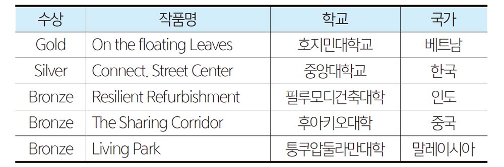 이번 공모의 주제는 ‘Pubic Spaces in 15-minutes Life Cycle’이다. 도보 15 분 생활권이라고 하는 것은 공공의 영역을 공유하는 이웃(Neighborhood)의 개념이고 그 경로에서 다양한 인간의 활동이 생성되고 교류되는 중요한 개념으 로 판단된다. 물론 그 범위는 일정하지 않으며 경로의 형태, 장소적 특성 등에 따 라 불규칙하다. 이번 학생건축공모전은 각 회원단체의 학생들로부터 이러한 공 적 영역에 대한 건축적인 해법을 어떻게 제공하고 그 결과로 어떠한 사회적, 물 리적 영향력을 이끌어 내는가를 조명하는 관점에서 제출된 작품을 심사하였다. 이번 학생공모전에 한국에서는 세 작품을 출품했는데 그 중 중앙대학교의 노경 철 학생의 작품이 은상을 수상하였다. 수상을 한 작품은 아래의 목록을 참고하기 바라며, 작품에 대한 자세한 내용은 아카시아 웹사이트(www.arcarsia.org)에 서 열람할 수 있다.