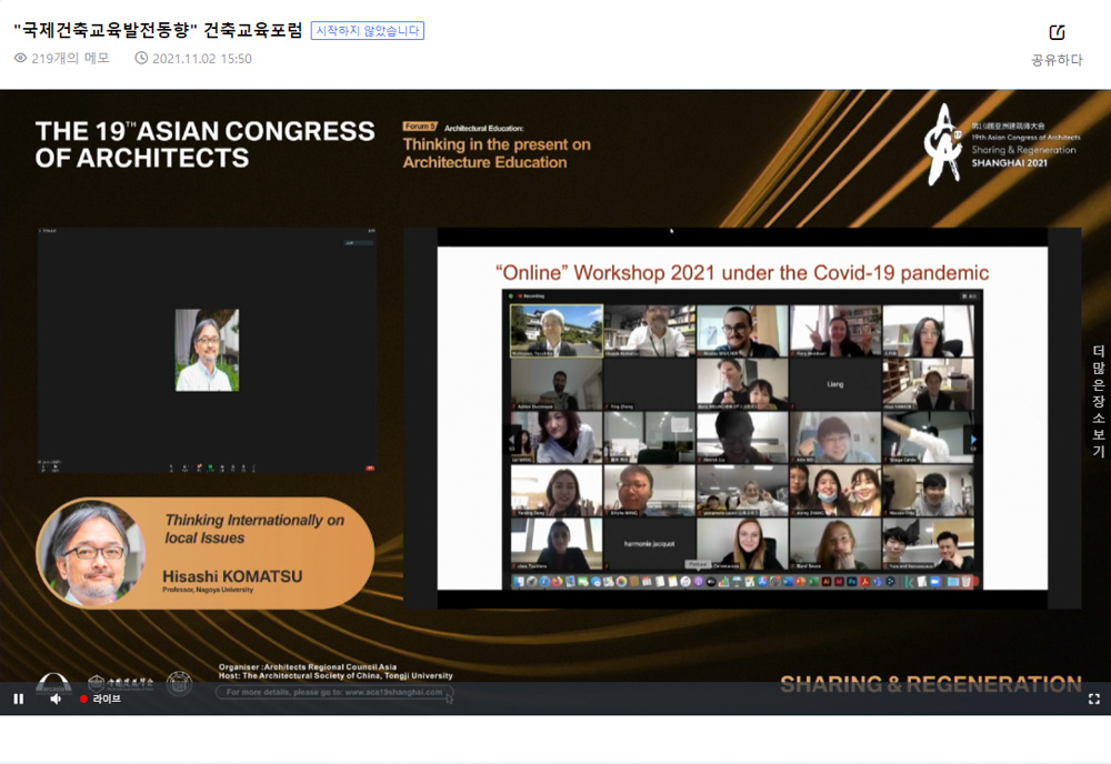 세 번째 발표자는 히라시 코마추 나고야 대학교 교수로서 ‘지역 이슈에 대해 국제적으로 생각하기’라는 주제로 발표하였다. 나고야 대학교 건축과는 팬데믹 이전부터 특정 지역의 활성화, 재생연구를 목표로 중국, 프랑스의 건축학교와 매년 국제적인 건축교육 교류를 진행하고 있다. 코마추 교수는 팬데믹 기간 동안 부딪힌 국제적인 교육행사 진행의 어려움에 대해 설명했다. 그는 어떻게 하면 원격이지만 같이 있는 느낌을 가질 수 있을까? 하는 질문부터 건축교육의 온라인, 오프라인 플랫폼의 필요성과 준비에 대해 강조했다.