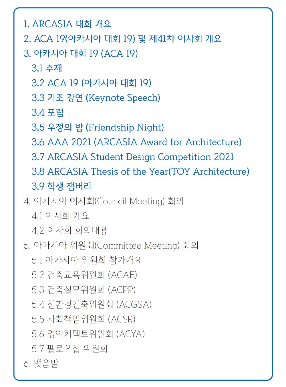 ACA 19(아카시아대회 19) 및 제41차 이사회(Council Meeting)는 중국건축학회(ASC)가 주관하여 2021년 10월 29일부터 11월 2일까지 5일간 개최되었다. 2020년 초부터 전 세계에 발생된 코로나로 인한 국가 간의 이동금지 및 집회금지로 인하여 2020년 10월로 1년을 연기하여 개최하기로 예정되었던 이 대회는, 2021년에도 팬데믹 상황이 개선될 전망이 보이지 않아 아카시아 회장단이 각 위원회의 위원장 및 각국의 의견을 청취하고 이번 대회를 주관하는 중국건축학회(ASA)의 준비상황을 면밀히 검토하여 모든 행사를 비대면 온라인으로 진행하기로 하였다. 지난 7월 브라질 리우데자네이루의 UIA 세계건축대회의 선례를 참고하고, 보다 원활한 진행이 가능하도록 전체 프로그램과 운영시스템, 그리고 참가자의 편의성 등을 고려하여 대회를 개최하였다.