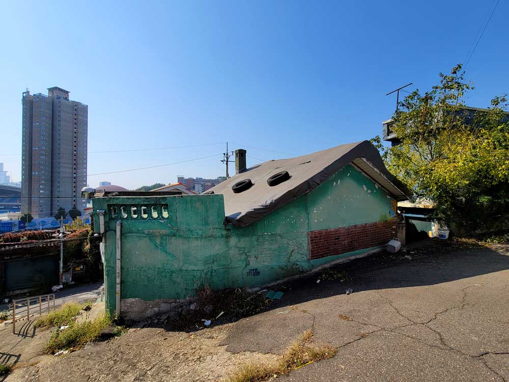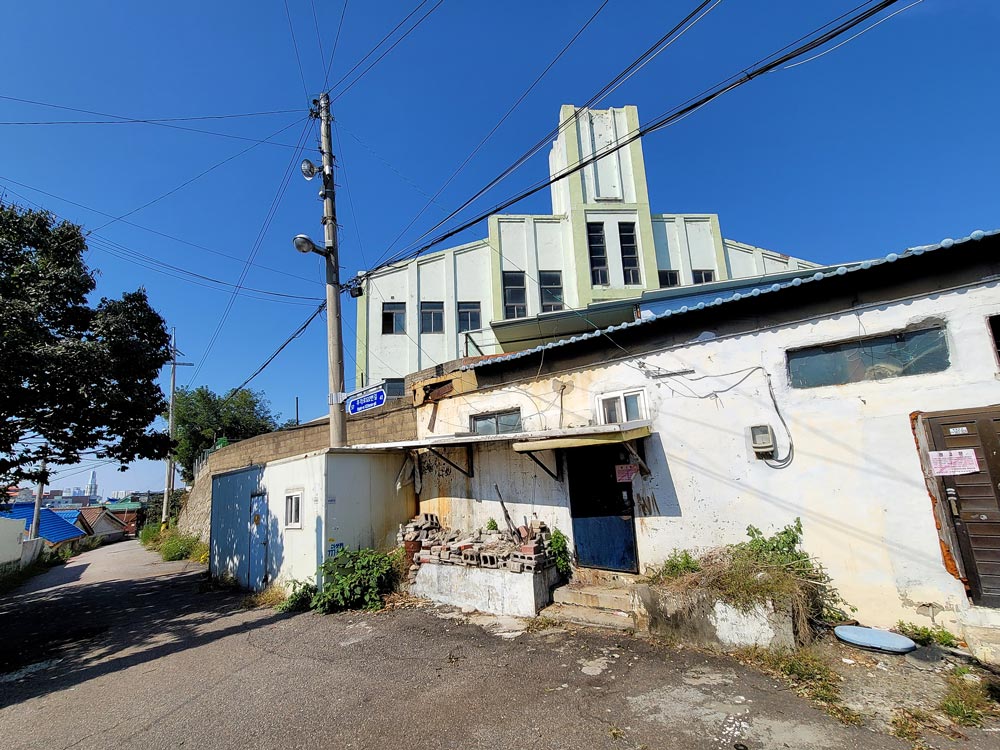 우각로 문화마을 위에는 성채와 같은 거대한 흰색의 건물이 서 있다. 마을이 그 건물을 중심으로 형성된 듯한 모습이다. ‘전도관’이라 불리는 이단 종교의 건물이다. 1957년 10월에 지어진 전도관은 한때 인천의 랜드마크였다. 원래는 선교사이자 의사였던, 초대 주한 미국 공사를 지낸 알렌이 1890년에 지은 여름 별장이 있었던 곳이었다. 1978년 전도관이 떠나고 1987년에 이단 종교 예수중심교회가 들어왔다가 떠난 이곳은 오랫동안 낡고 비어있었지만, 마을의 그 어디에서도 보이는 그 형체만으로도 여전히 마을의 상징이 되고 있었다.