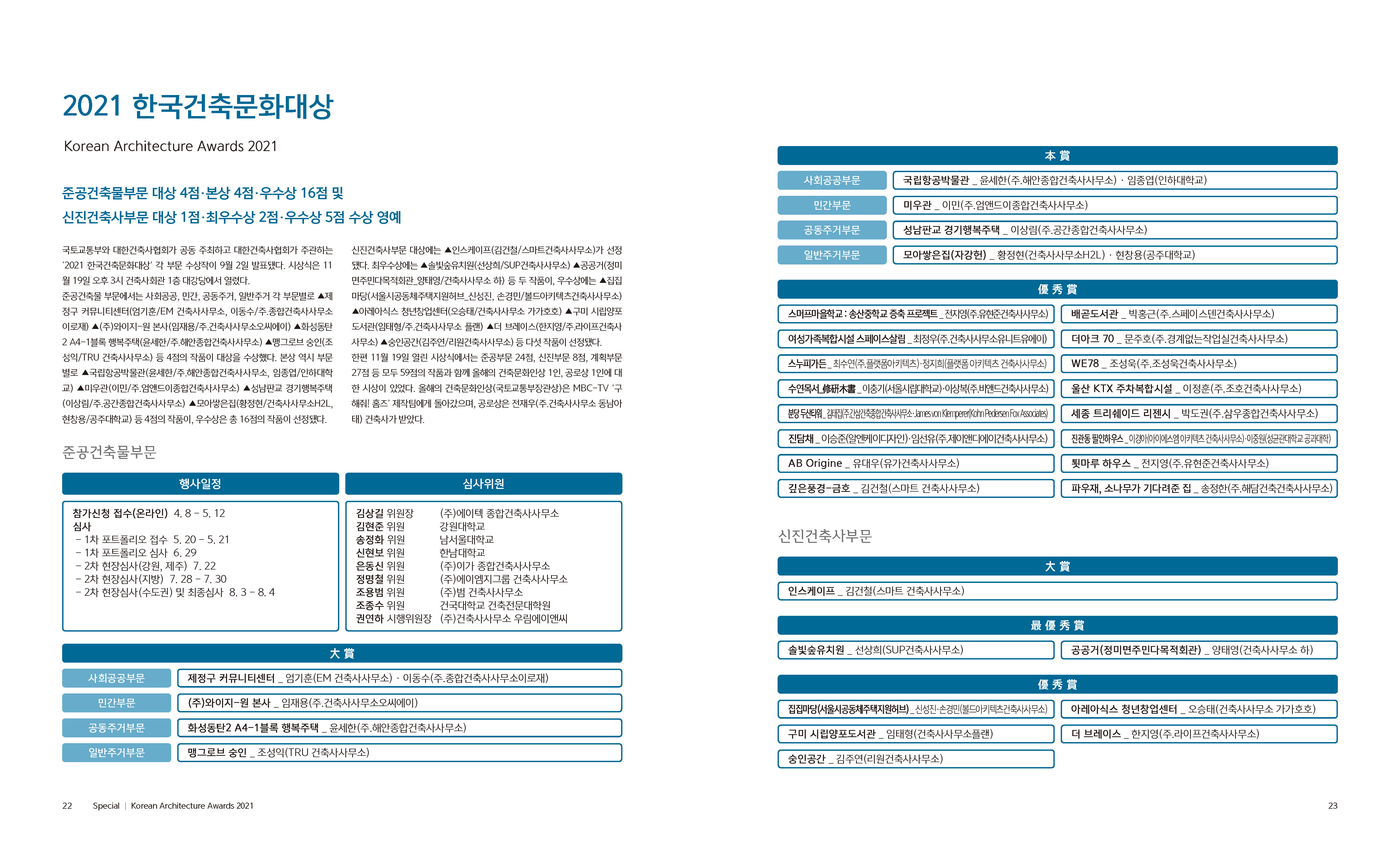 | 2020 한국건축문화대상 준공건축부문 2020.12 (0) | 2023.01.27 |