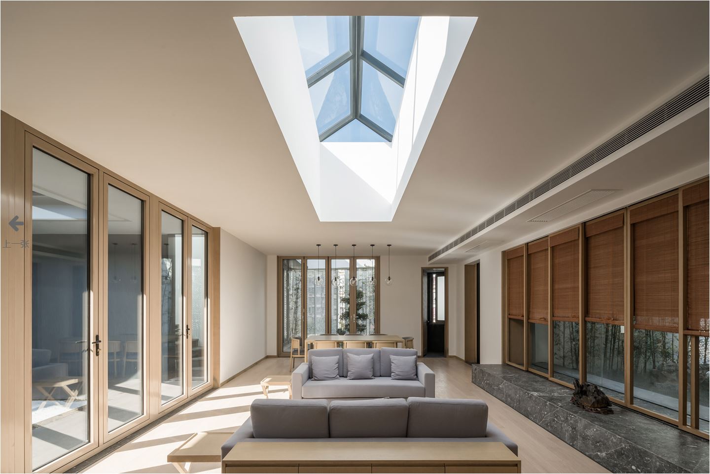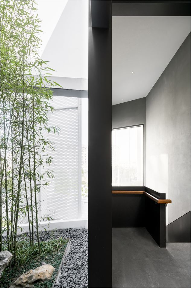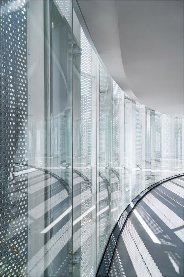실내의 긴 복도는 밖으로부터 풍부한 채광이 내부로 들어오도록 디자인됐다. 또한, 공간의 리듬감을 살리기 위해 금속의 기둥과 그사이로 비추는 채광의 그림자가 마치 병풍처럼 실내에 비치도록 했다.