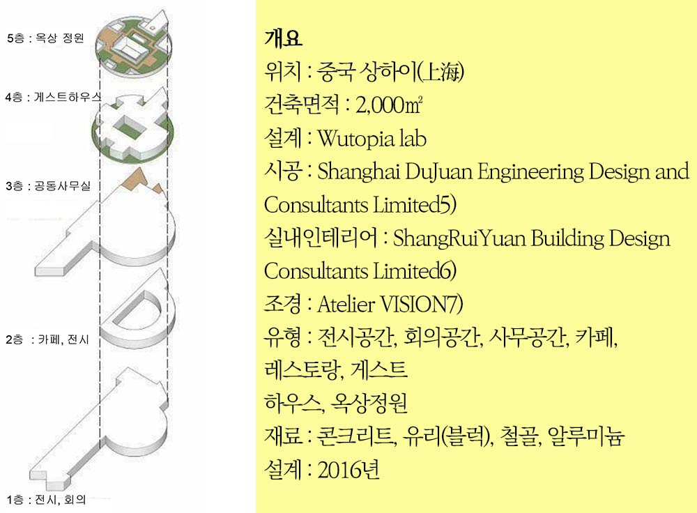 상하이에 기반을 두고 있는 유토피아 랩-Wutopia Lab-은 복잡한 현대 건축물의 새로운 패러다임에 기반을 둔 건축사사무소로 상하이의 수석 건축사 유팅-YuTing-에 의해 설립됐다. 이 곳은 상하이의 문화와 생활 방식, 인간의 라이프 스타일에 초점을 맞춰 도시 생활의 다양한 측면과 도시의 생활 방식을 연구하여 건축물을 디자인한다. 중국의 건축에 미학적인 부분에 집중하고 완성도를 높이기 위해 노력하며, 조경과 인테리어 디자인과 함께 건축물의 초기 계획단계에서부터 설계 및 현장 시공의 경험을 바탕으로 프로젝트를 진행하고 있다.