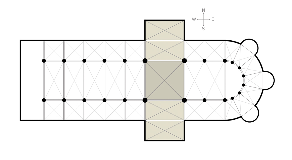 이것만으로는 부족하다. 창문을 더 늘리는 방법이 있는데, 그것은 트랜셉트(transept)다. 트랜셉트는 성당을 위에서 보았을 때 라틴 십자가처럼 보이게 한다.<사진 4> 트랜셉트 디자인은 신학적 상징이 더 큰 목적이었는지 모른다. 하지만 결과적으로 창문이 늘어나는 효과를 보았다. 또한 동쪽 벽에 여러 개의 반원형 앱스(apse)를 추가하는데, 이 앱스 역시 더 많은 창문을 추가해 준다.<사진 5> 마치 서양 주택의 코너 타워나 퇴창처럼 창의 면적을 늘려준다. 작은 앱스들 역시 표면적으로는 신학적인 목적으로 만들었겠지만 빛 부족이라는 문제를 해결해 준다. 이런 이유 때문인지 작은 성당에는 트랜셉트나 추가된 앱스가 거의 없다고 한다. 성당 건물의 크기가 커지면 형태도 변화할 수밖에 없는 것이다.