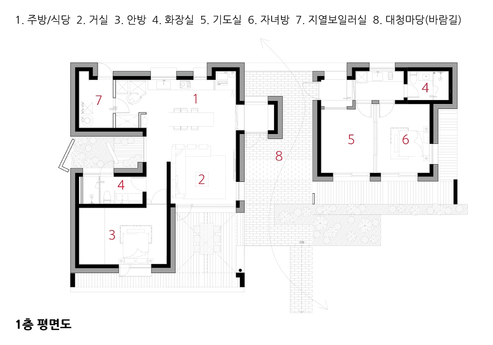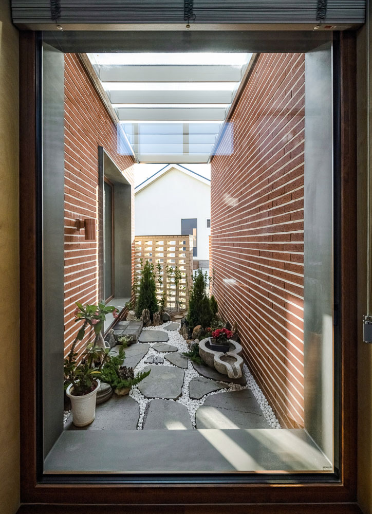 지붕으로 엮고, 기초로 이어지다 - 땅과 하늘은 하나로 이어진다. 그리고 하늘과 땅 사이에 사람이 머문다. 붉은 벽돌의 수평선 바닥과 반사되는 하늘의 지붕 처마 선 사이로 생활이 스며드는 공간이 만들어졌다.