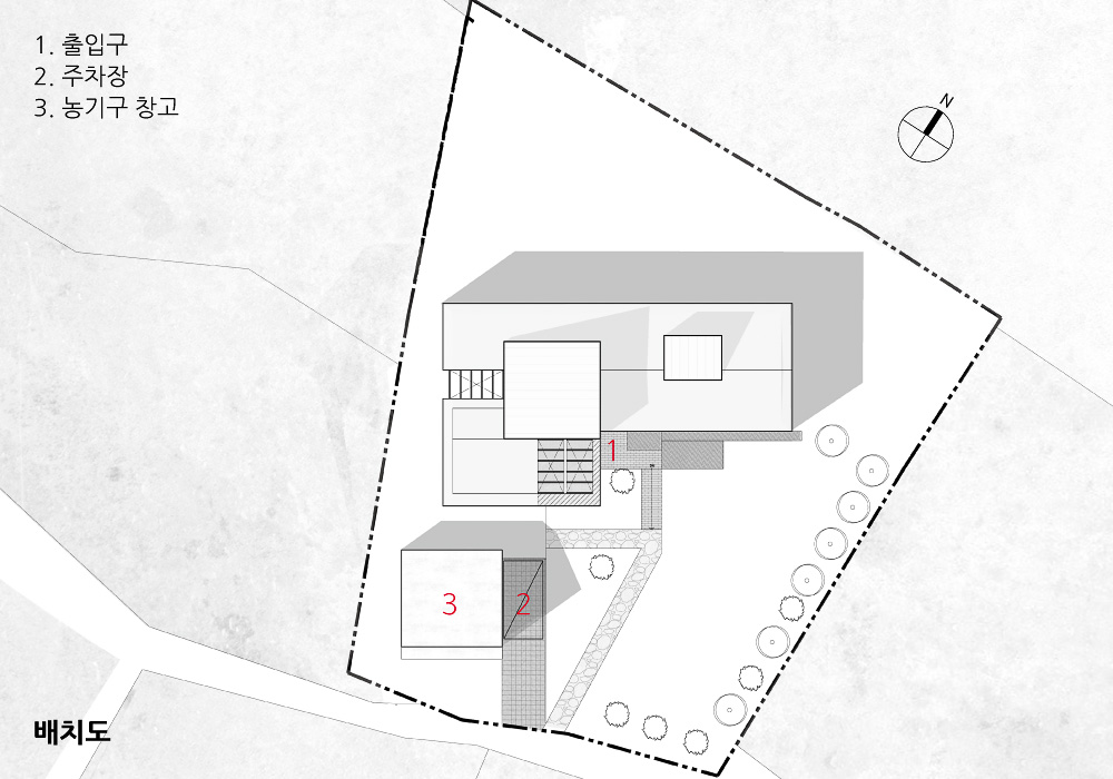 땅을 따라가다 - 땅을 만나고, 동네를 한 바퀴 돌았다. 전형적인 시골 마을이다. 한적한 전원 풍경은 땅을 따라 낮게 깔린 집들이 있었음을 말해준다. 이 조용한 마을에 혼자 설악산 울산바위를 감상하겠다고 층을 올리기엔 너무 이기적이다. 그냥 이 동네에 맞게 땅을 따라가자. 그렇게 단층을 제안하고 배치를 고민했다.