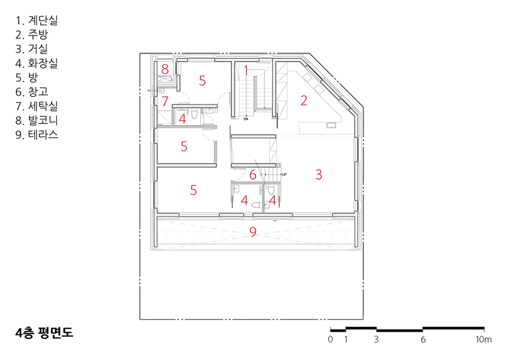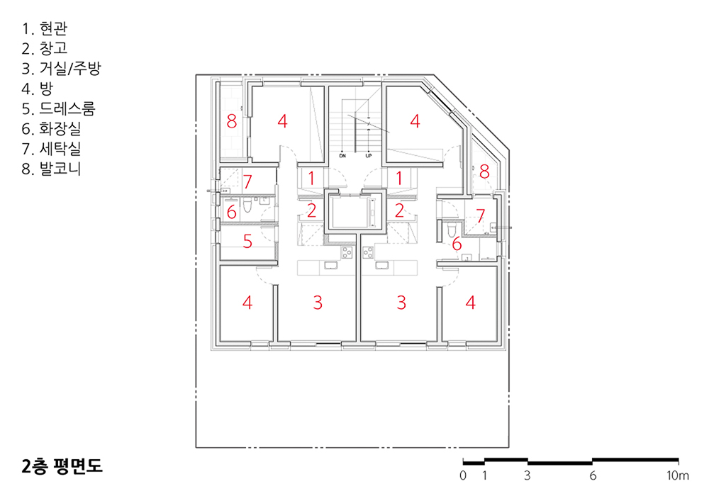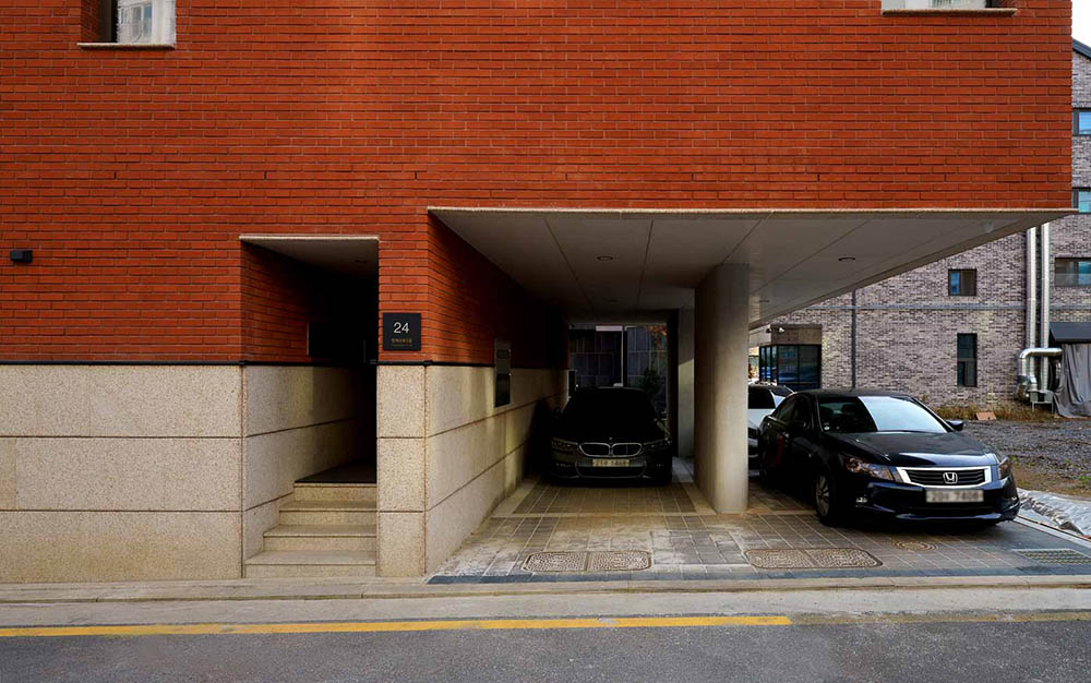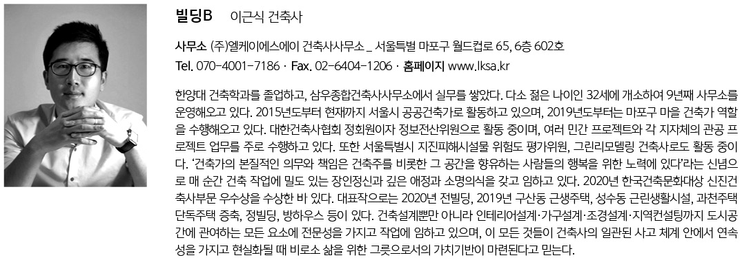 BLDG.B Architect | Lee, Keunsik _ LEE KEUN SIK Architects Client | Baek, Myungjin Supervisor | Lee, Keunsik _ LEE KEUN SIK Architects Construction | TOHAUS Architecture Interior Design Project team | Kim, Sungjoo / Jo, Seungwook / Bae, Chungeun Location | Cheonggyesan-ro 3-gil, Sujeong-gu, Seongnam-si, Gyeonggi-do, Korea Program | Neighborhood facility & Multifamily house Site area | 251.30㎡ Building area | 149.17㎡ Gross floor area | 401.81㎡ Building to land ratio | 59.36% Floor area ratio | 159.89% Building scope | 4F Structure | RC Exterior finishing | Brick, Stone Interior finishing | Paint, Silk wallpape Design period | Nov. 2019 - Apr. 2020 Construction period | Jun. 2020 - Aug. 2021 Photograph | Gu, Uijin Structural engineer | LAIM Mechanical engineer | JUSIN MEC Electrical engineer | ELLIM Fire engineer | JUSIN MEC / ELLIM |