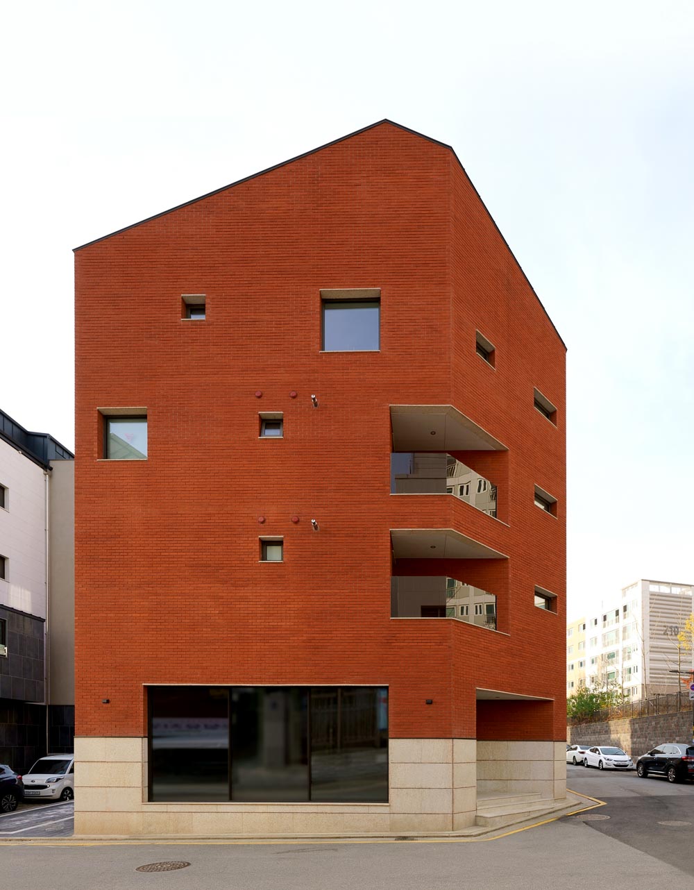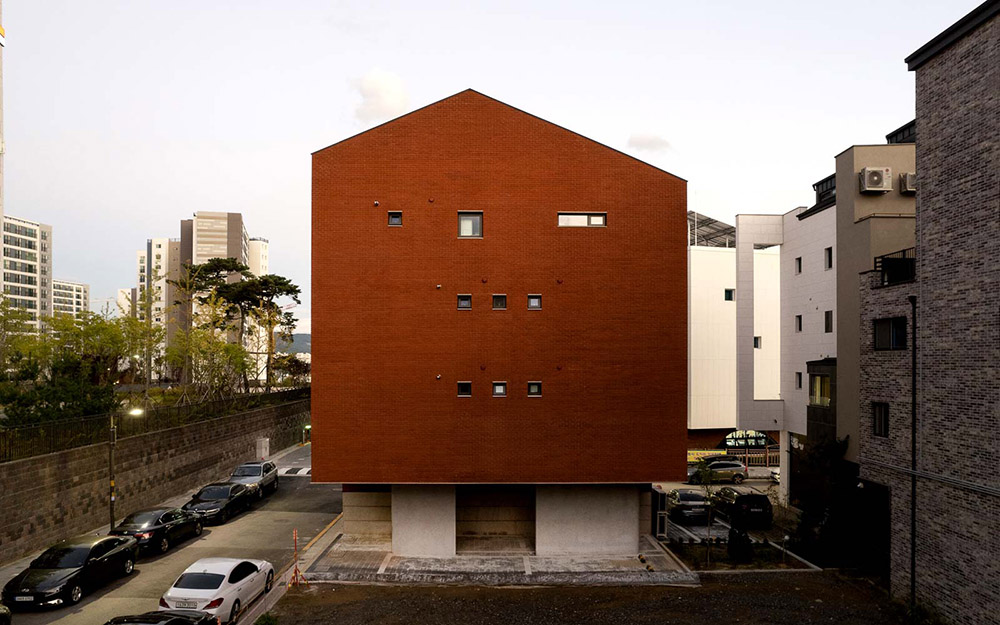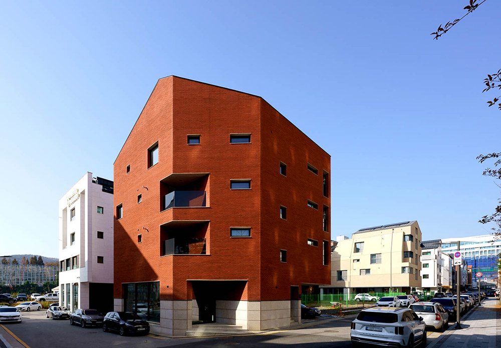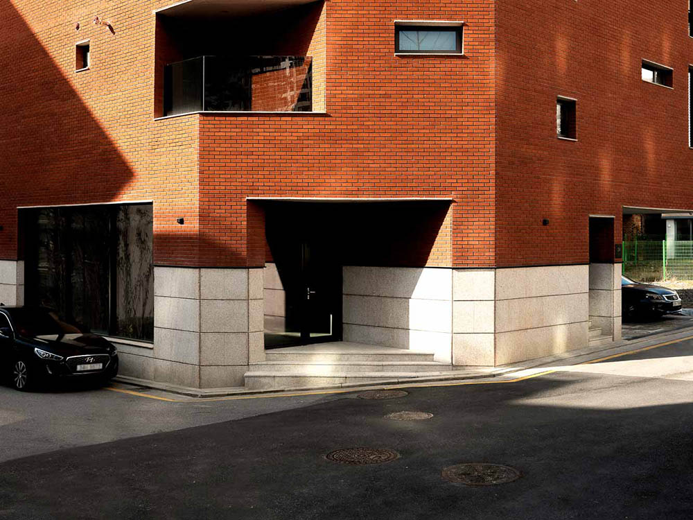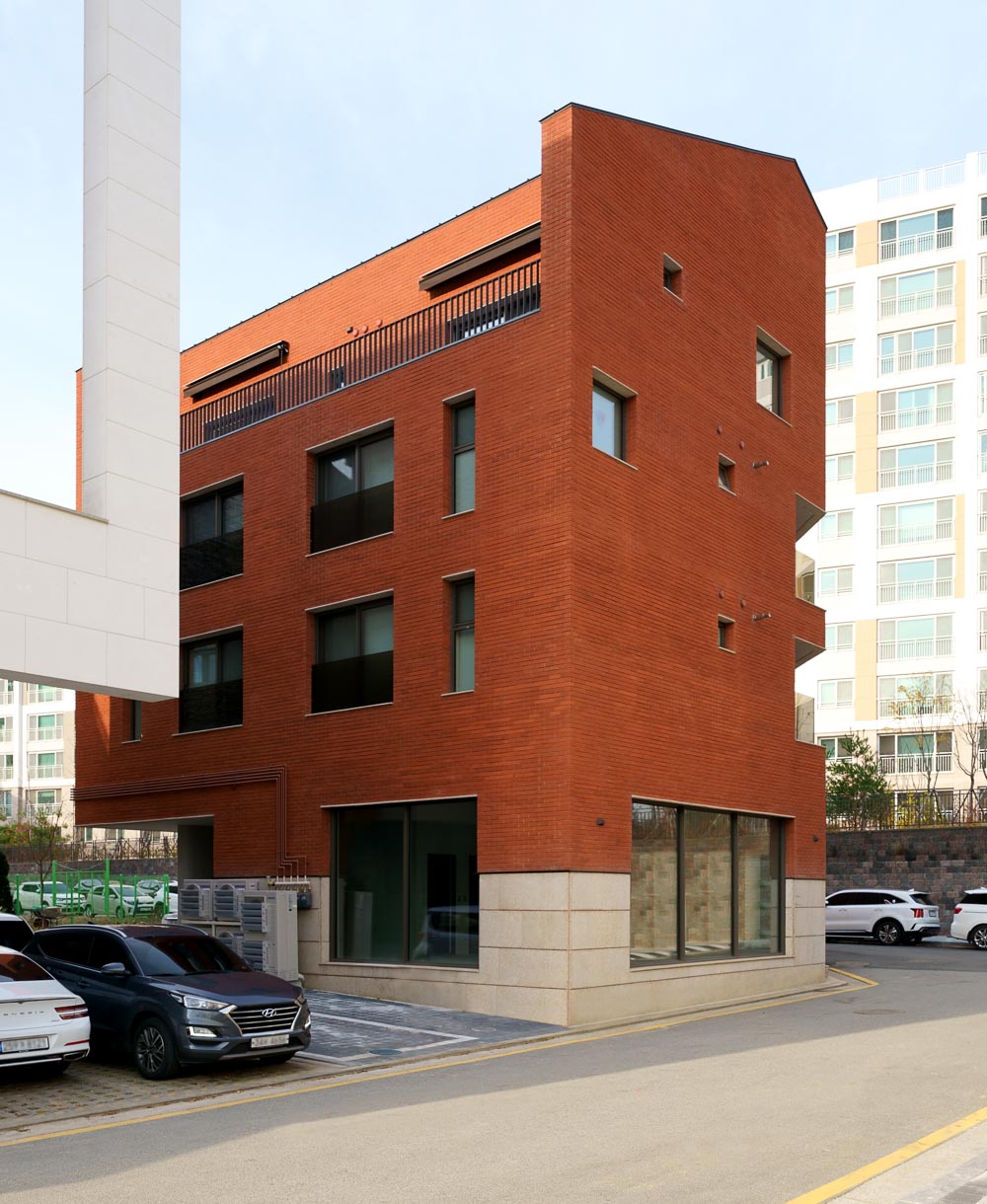 The land at the corner of the block gave reason for planning the shape of a mass that emerged in form. Bright granite was placed on the first floor to enhance the relative sense of richness on the upper solid mass of the red brick. We used the same granite on the podium for the window sill and lintel of the opening to give a lively rhythm to the façade. We tried to make a stable but vivid scene through the combination of red brick and granite. In addition, we intended to form a polygonal polyhedron like a red jewel, combining a flat cut edge and a vertical displacement of a pitched roof.