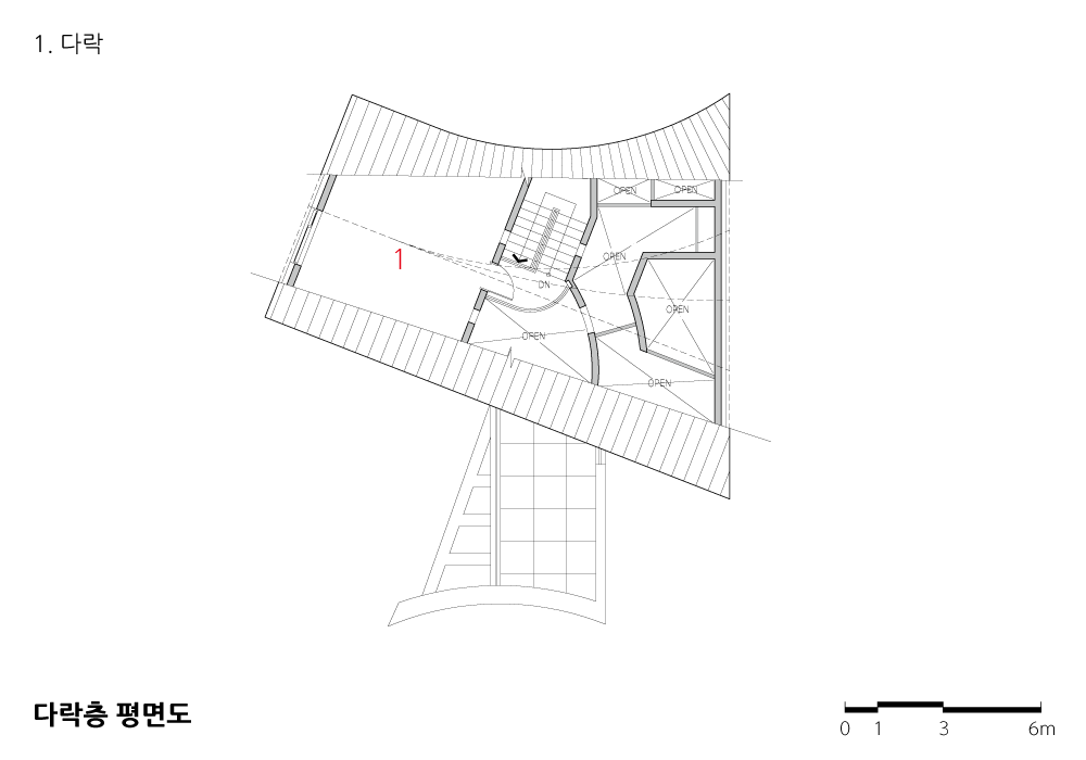 The curves and straight lines of the building and the shape formed by the piloti space are linked together. The two pillars supporting the building are split in the shape of Siot(ㅅ) like a root, and it is a structurally necessary element and a signal that symbolizes access.