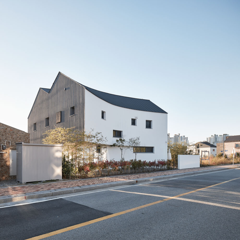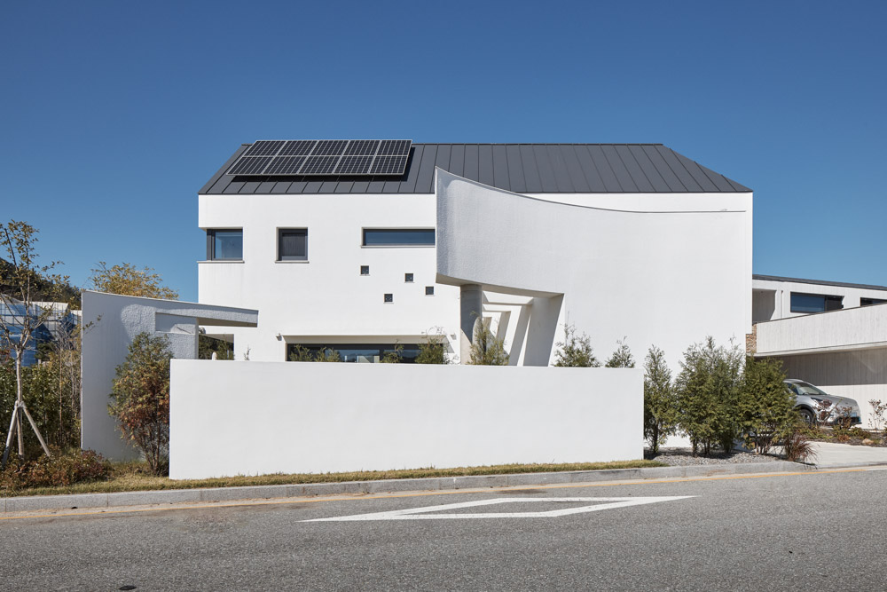 하나에서 시작한 곡선과 직선으로 갈라지는 형상이 매스의 중압감을 만든다. 측면의 수직 패턴과 2층의 공중에 떠 있는 듯한 형태가 가벼움을 가미해 줄 요소다. 주차장과 주차 진입로는 건축물의 북서쪽으로 배치하고 남서쪽에는 마당을 확보하였다. 동쪽으로 인접 대지로부터 이격된 공지가 있는데, 필로티 공간과 접하게 하여 자연스럽게 어우러지는 느낌을 만들었다. 마당의 좌측 끝 외부 창고와 중앙 앞쪽의 가벽이 도로에서 앞마당 시선 간섭을 최대한 줄이게끔 하고, 시크릿 정원을 완성했다. 수직 벽과 건물의 조화를 위해 가벽은 곡선으로 만들었다.