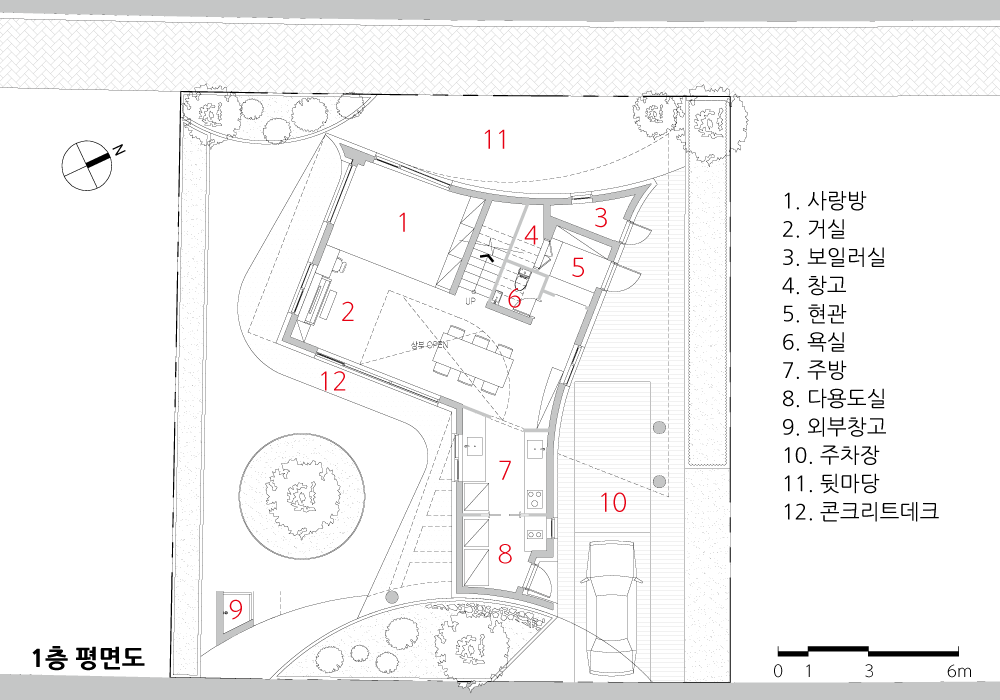 아이들을 위한 작은방 두 개와 부부를 위한 안방, 다양한 사용자를 고려한 욕실 셋, 다락 하나, 손님을 위한 사랑방. 건축물이 자연스럽게 마당을 잘라내면서 생기는 마당 공간은 텃밭, 커브 정원, 가족을 위한 마당, 화단으로 나뉜다. 거실에서 마당 사이 유연한 콘크리트 선이 있는 덱은 건물의 주변을 둘러싸고 지면에서 느낄 수 있는 자유 곡선이 된다.