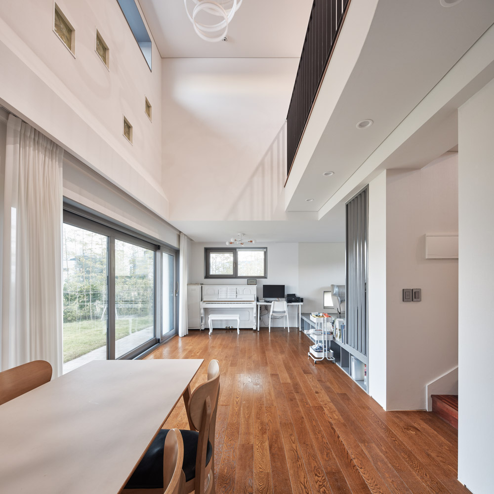 건물의 단면을 보았을 때, 1층에서 다락까지 연결된 공간이 있고 가족들이 각각 사용할 공간들은 개인 방 이외에는 모두 노출된다. 그리고 거실 한 공간으로 시선을 둘 수도 있다. 색이 있는 유리블록을 군데군데 벽에 넣어 공간을 다채롭게 만들고, 특별한 이목을 끌게 하였다.