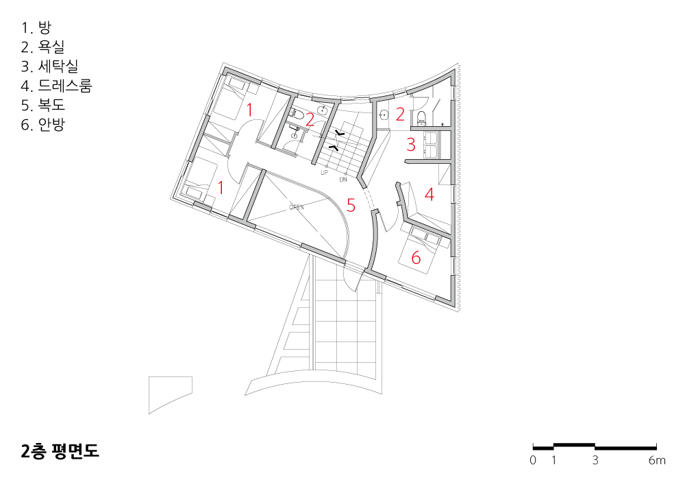 뒤쪽 큰 도로에 접한 입면을 방향성이 없는 둥근 곡선 형상으로 보정하여, 집의 배치가 이상한 듯한 느낌에서부터 벗어나고 싶었다. 건물의 후면 곡선 형상과 전면 직선 형상이 결합하면서 건축은 남향으로 배치된다.