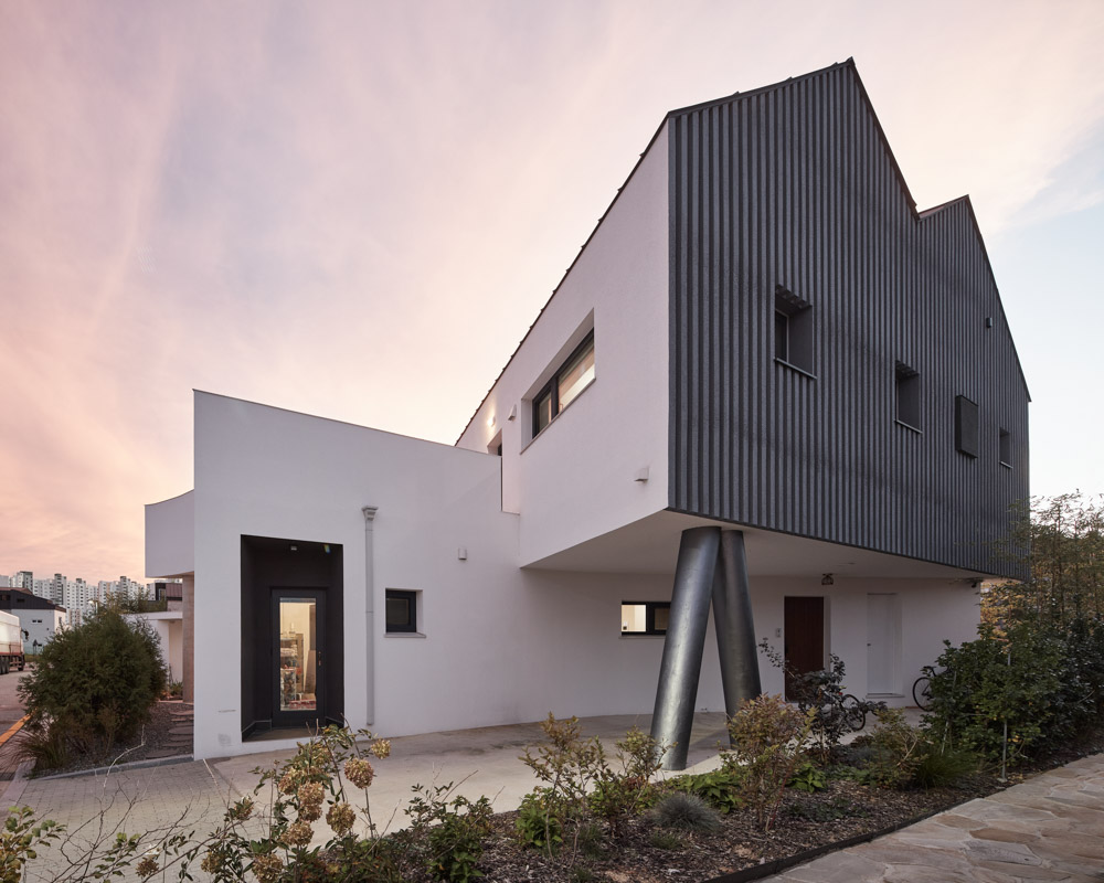 하나에서 시작한 곡선과 직선으로 갈라지는 형상이 매스의 중압감을 만든다. 측면의 수직 패턴과 2층의 공중에 떠 있는 듯한 형태가 가벼움을 가미해 줄 요소다. 주차장과 주차 진입로는 건축물의 북서쪽으로 배치하고 남서쪽에는 마당을 확보하였다. 동쪽으로 인접 대지로부터 이격된 공지가 있는데, 필로티 공간과 접하게 하여 자연스럽게 어우러지는 느낌을 만들었다. 마당의 좌측 끝 외부 창고와 중앙 앞쪽의 가벽이 도로에서 앞마당 시선 간섭을 최대한 줄이게끔 하고, 시크릿 정원을 완성했다. 수직 벽과 건물의 조화를 위해 가벽은 곡선으로 만들었다.