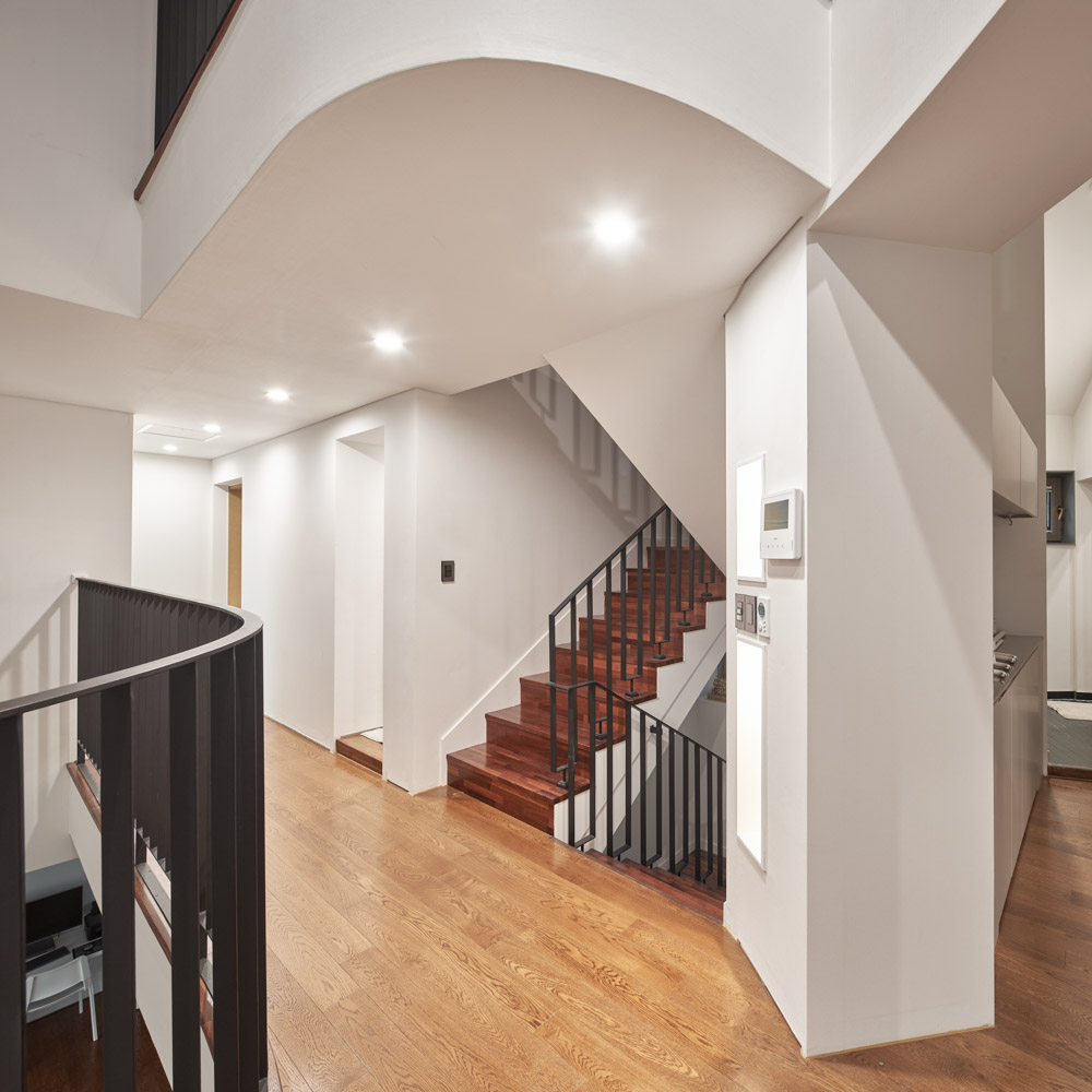 뒤쪽 큰 도로에 접한 입면을 방향성이 없는 둥근 곡선 형상으로 보정하여, 집의 배치가 이상한 듯한 느낌에서부터 벗어나고 싶었다. 건물의 후면 곡선 형상과 전면 직선 형상이 결합하면서 건축은 남향으로 배치된다.