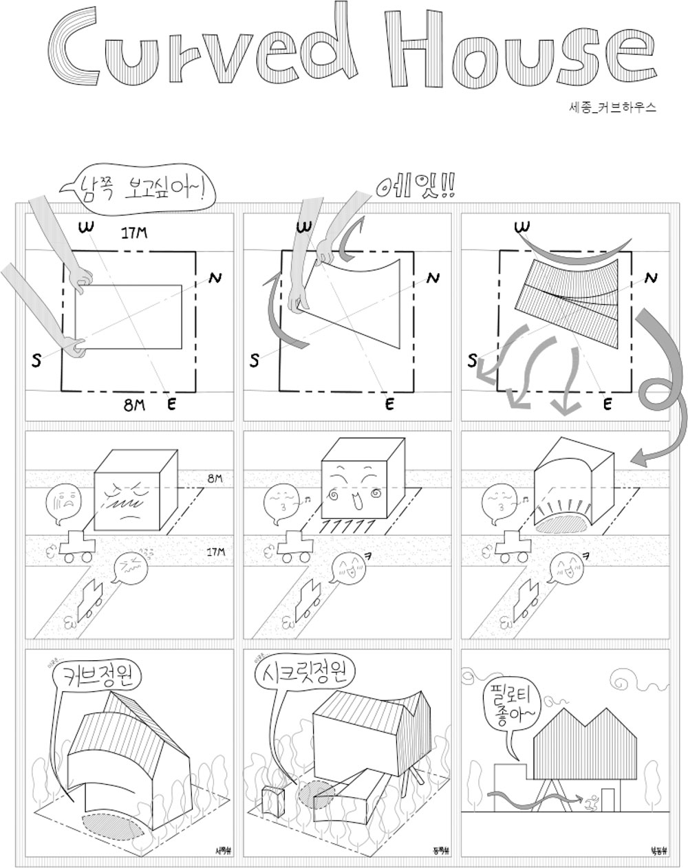 | 커브 하우스 설계자 | 김동희_건축사사무소 케이디디에이치 건축주 | 유민기, 김현숙 감리자 | 김수홍 _ (주)오즈건축사사무소 시공사 | 직영공사 설계팀 | 김도연, 손정용, 김아름, 정혜수, 애블린, 박성찬 대지위치 | 세종특별자치시 고운북7길 32 주요용도 | 단독주택 대지면적 | 360.00㎡ 건축면적 | 116.97㎡ 연면적 | 175.09㎡ 건폐율 | 32.49% 용적률 | 48.64% 규모 | 지상 2층 구조 | 철근콘크리트구조 외부마감재 | STO 외단열시스템 내부마감재 | 페인트, 벽지, 타일 설계기간 | 2018. 09 - 2019. 09 공사기간 | 2019. 09 - 2020. 10 사진 | 이한울 구조분야 : 황경주 + (주)세움건축구조 기계설비분야 : 대림ENC 전기분야 : 대림ENC 소방분야 : 대림ENC |