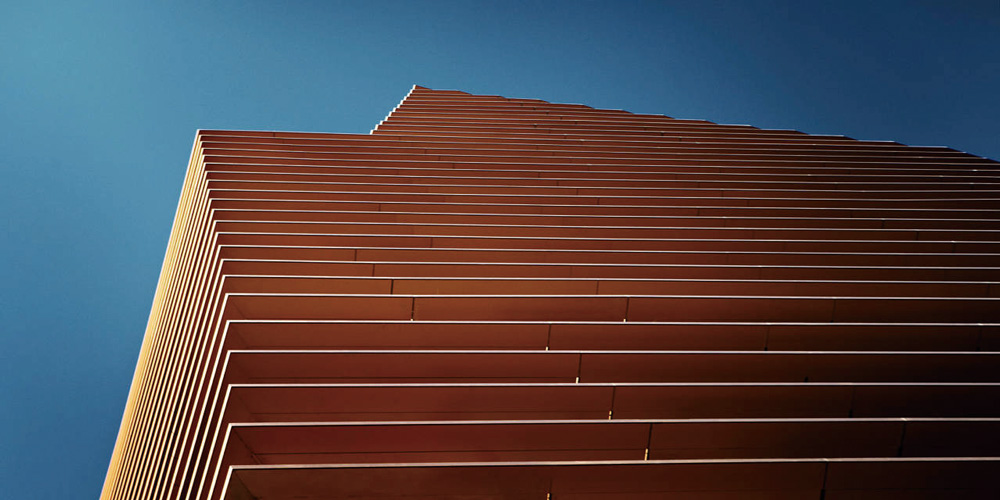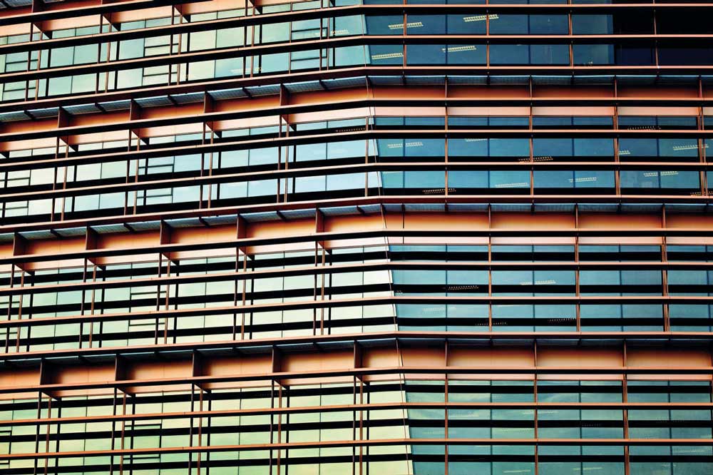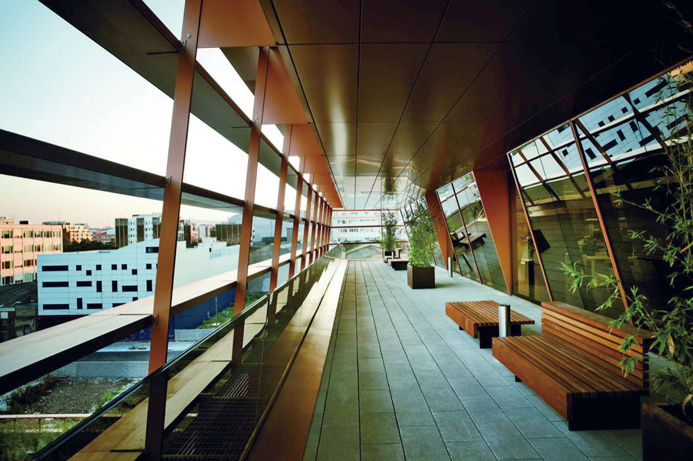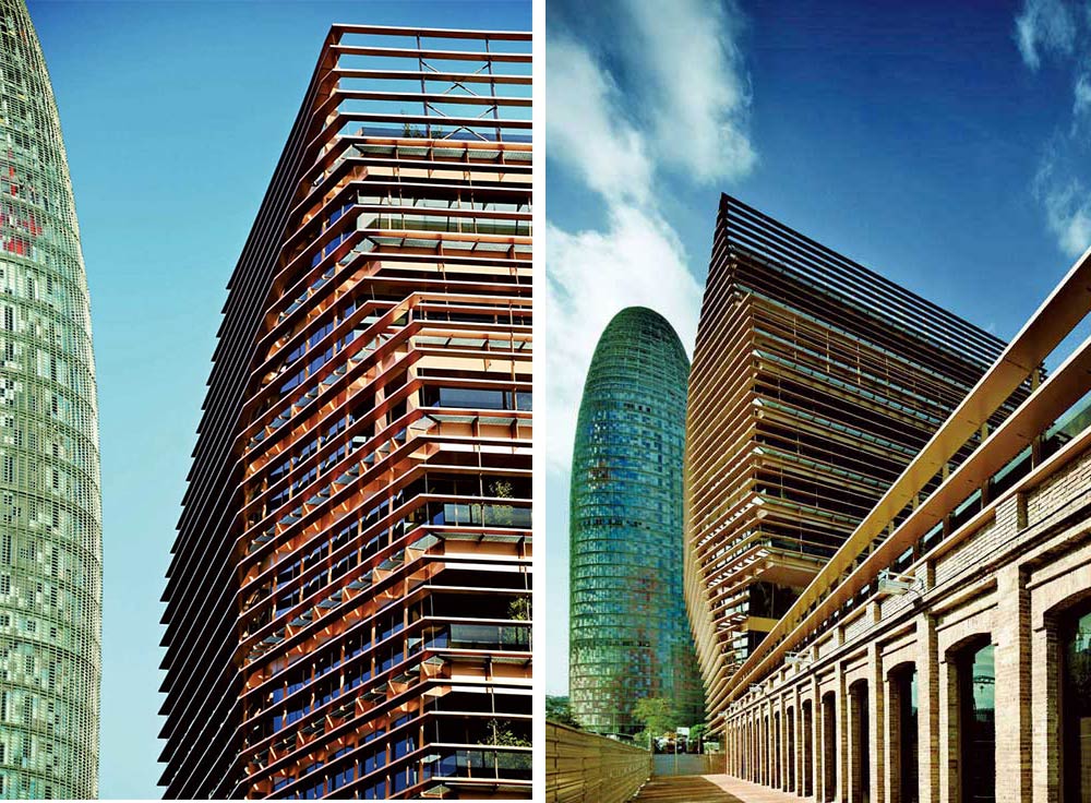 수평 루버는 갈바나이징 처리가 된 철판 12mm로 제작했다(물론 기온 차에 의한 철판의 수축, 팽창에 움직일 수 있도록 파사드의 창호 모듈에 맞추어 나누어 놓았다). CMT 사옥의 외피의 표현은 이 건물 바로 뒤에 위치해있는 장 누벨-Jean Nouvel- 의 아그바 타워-Agbar Tower- 와는 무척 대조적이다. 아그바 타워의 화려한 색상과 이중외피 커튼월의 투명성은 바르셀로나 비즈니스 지역의 아이콘이 되었는데, CMT 사옥의 볼륨 위를 감도는 갈색 철판 루버의 표현은 아그바 타워와는 반대로 모노톤의 무게감과 다가가면 갈수록 점점 더 솔리드화 하는 것이다. 이들은 특정 거리 뷰에서는 서로의 얼굴에 대한 배경-Background- 이 되면서 이야기 하는 것 같다.
