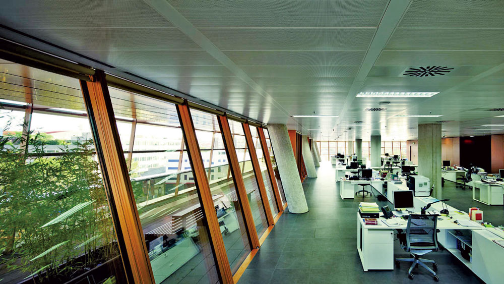 사무실 볼륨의 향을 살펴보면 남동-북서향으로, 남동쪽으로는 높은 고도의 태양빛을 많이 받기 때문에 이를 긴 수평 루버를 사용함으로써 차단하고 사무실 공간 앞으로 한 번 더 테라스 공간을 두었다. 결국 사무실 안으로 들어오는 강한 빛은 감소되기 때문에 여름철 냉방 비용을 줄이는데 아주 효과적이다. 반대로 북서향을 향하는 정면은 수평루버를 그대로 적용했지만, 테라스 공간이 존재하지 않는다. 남동쪽·북서쪽 향에 상관하지 않고 수평루버를 일관적으로 적용한 것은 에너지 절약 측면에서 최적화된 것은 아니다. 서향일수록 고도가 낮은 저녁 빛을 차단하기 위해 루버의 방향을 바꾸는 것이 최적화하는 것이겠으나 미관적으로 건물의 외피에 일관성을 부여하고, 북부·중부 유럽과는 달리 스페인은 강한 햇빛의 영향을 많이 받기 때문에 수평 루버를 적용한 것이다. 주요 외벽의 종류는 남동쪽, 북서쪽 두 가지로 나뉜다. 남동쪽의 외벽은 테라스가 있는 쪽으로 창호 앞 쪽으로 사선으로 루버 설치면과 맞닿아서 공간의 역동성과 아늑함을 동시에 느끼게 한다. 반대로 테라스 없는 곳의 외벽 단면은 루버 설치면과 평행하게 커튼월의 유리면도 기울어져 있어 내부의 사무실 공간에 빛이 들어오는 각도를 조절한다.