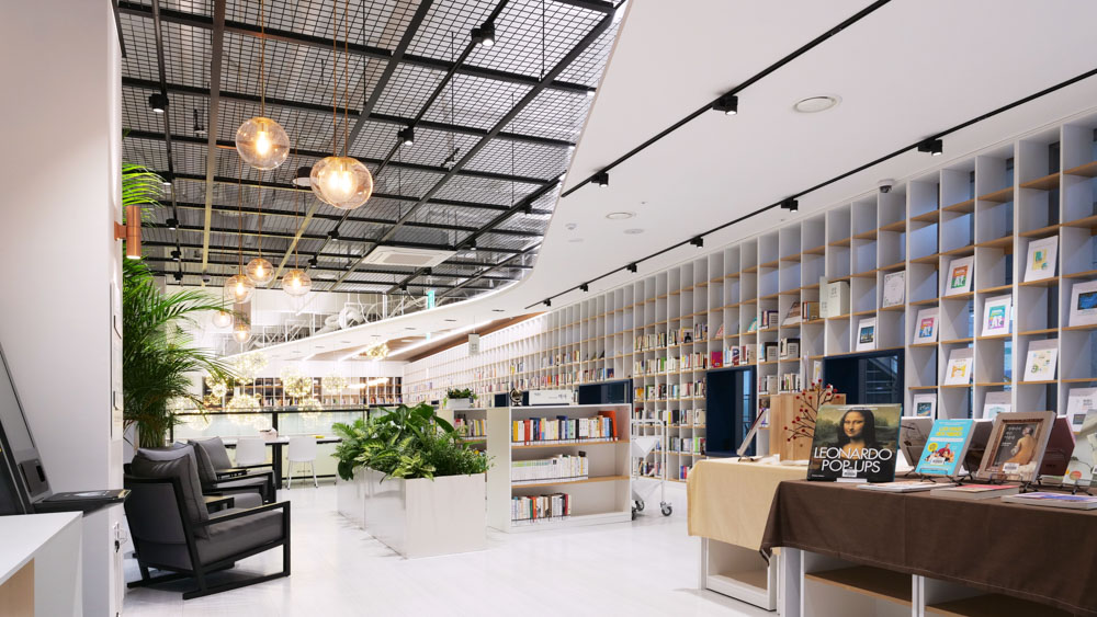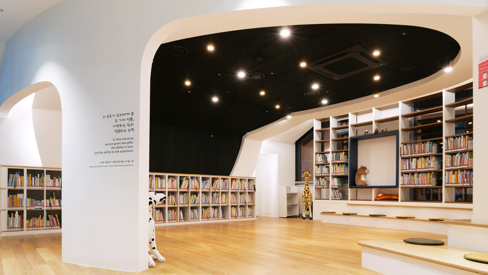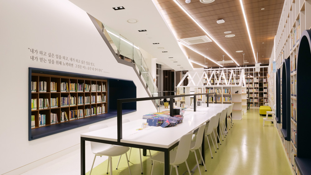 In general, public libraries tend to have divided space by programs such as an adults' reading room, a children's reading room, an infants' reading room, a reference library room, a computer room, and an education room. However, it is often difficult for a small-scale district library to cope with space limits, the demand for various programs, and the expansion and change of space over time. Overcoming space limitations, the area secures its territoriality and openness, which allows the manager to freely change the space in response to changing library programs and cultures. To this end, a wall-mounted shelf is used in such places as a reference library room to accommodate 30,000 books instead of fixed furniture. Depending on the height and location of a wall-mounted bookshelf, it is used for different purposes, and in particular, the higher part serves as a library storage room with old books. The bookshelf draws eyes, opened to the outside, into the inside of the library while creating a visual relationship with the external environment by extending the pocket space and the back of the bookshelf. Some of the wall-mounted bookshelves are used for library promotion and exhibition purposes to introduce a variety of events and recommended books to the outside world.