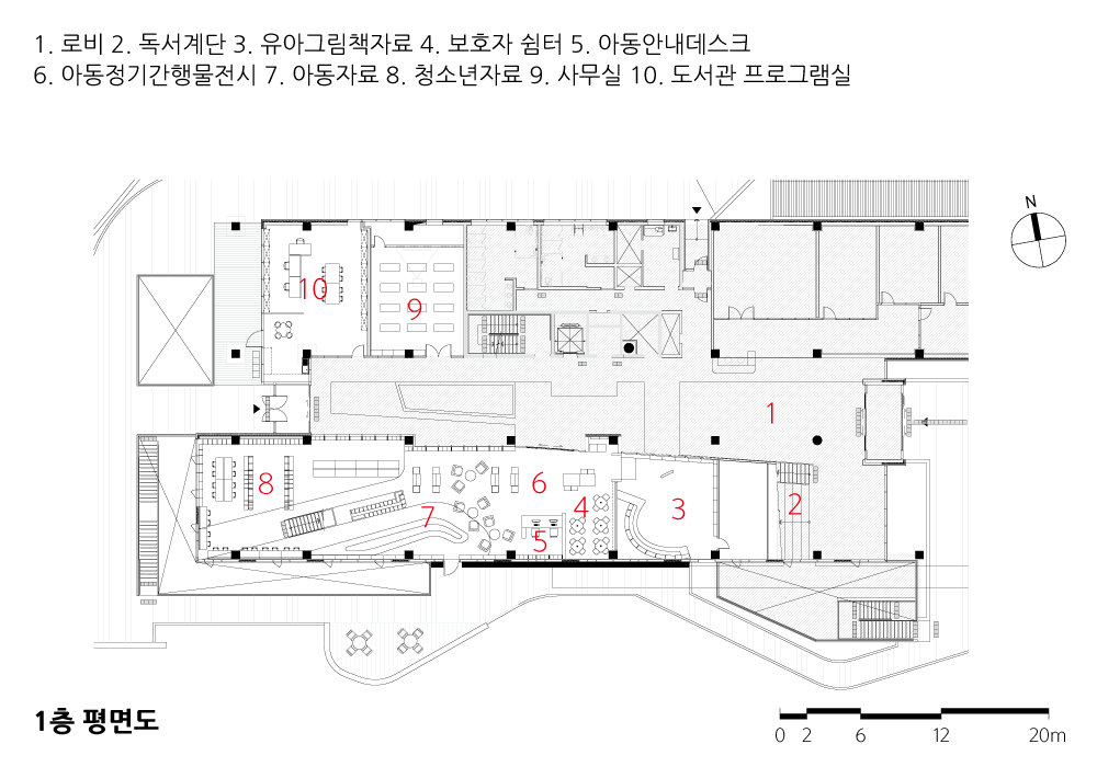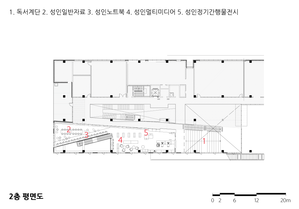 According to the user's age, each room, such as an adult's room, a children's room, and an infants' room, is on a different floor. The space, divided diagonally by the staircase, flows and connects areas through the expansion of the zone and the floor and ceiling pattern design. The low space under the stairs on the first floor above the ground is a children's zone that needs parental protection. A buffer zone (information desk, children's publicity/exhibition zone) is constructed in a cozy oval space to avoid being affected by the surroundings. The left and right sides of the diagonal staircase expand into a children's zone and a youth zone. Using the lower part of the staircase, the pocket bookshelf divides zones and connects them again visually. Users can recognize each zone through individual identities of the zones: the oval infants' area with a motif of a new life, a children's zone with a diagonal tiered seat and pattern that contains a collective culture, and a youth zone with a house feeling for having an independent self. The adults' reading zone on the 2nd floor is divided by a diagonal staircase, from the entrance to the information desk, into dynamic spaces such as an adult publicity/exhibition zone, a media reading zone, and a relaxation zone; and static spaces such as an adults' reading room, a reference library room, and a laptop desk. In addition, the areas are connected by the pattern design of the floor and the ceiling.
