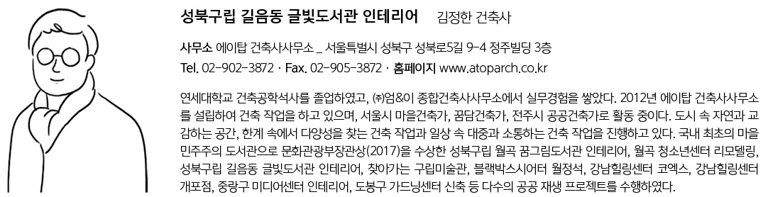 | 성북구립 길음동 글빛도서관 인테리어 설계자 | 김정한_에이탑 건축사사무소 건축주 | 성북구청 설계의도구현 | 에이탑건축사사무소 시공사 | (주)토퍼스디자인 설계팀 | 이제원, 오은영, 김인서 대지위치 | 서울특별시 성북구 길음로 7길 20 지상1, 2층 주요용도 | 공공도서관 대지면적 | 4,143.50㎡ 건축면적 | 1,921.99㎡ 연면적 | 9,484.68㎡ 중 726.07㎡ 건폐율 | 46.39% 용적률 | 114.57% 규모 | 지하 2층 - 지상 4층 중 지상 1, 2층 도서관 구조 | 철근콘크리트구조, 철골구조 내부마감재 | 지정데코타일, 친환경페인트, 지정 LPM 가구, PVC 시트마감 설계기간 | 2020. 02 - 2020. 06 공사기간 | 2020. 08 - 2020. 11 사진 | 김정한 전문기술협력 - 기계설비분야 : (주)토퍼스디자인 - 전기분야 : (주)극동파워테크 |