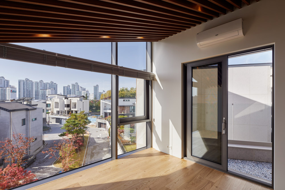 'Suwan House' is for mothers, fathers, and two daughters. The site of the house is located within the townhouse complex. A square mass was placed to fit the fan-shaped land. Various semi-external spaces such as various terraces were placed in the gap. The sunken was planned in the gap. This solves the problem of mining and ventilation underground. Underground is a space vulnerable to moisture, so a large window was planned. When all the doors of the space are opened, one movement line is planned. The large window and unblocked movement provide 'a wind path' for pleasant ventilation of the underground space. Users can directly enter the house from the basement. Three sides of the 'Suwan House' site are buried in the ground. The main gate is placed underground at the level. The spacious porch on the first floor makes it easy to store children's bicycles or a baby carriage. The living room and kitchen were planned side by side. I planned my children's playroom next to the kitchen pantry. This is a playroom for children and a space for storing toys. In the design process, the storage area was separately divided to create a pleasant living room for both parents and children. The second floor is a private area for the family. On the second floor, there are a parent's bedroom and a children's room. The areas of parents and children were completely separated so that there was no inconvenience in sharing private areas even after the two daughters grew up. The third floor is a leisure space for parents. The terrace in a different direction from the second floor was planned. An assistance kitchen was placed next to the terrace. It is a space that assists in enabling various activities on the terrace.